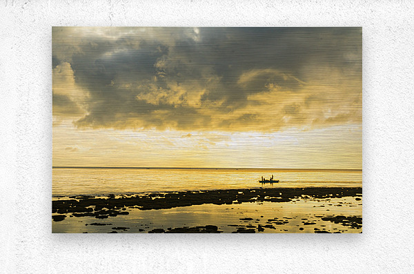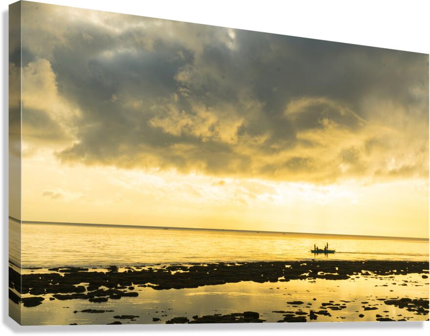 This captivating nature landscape photograph captures the serene beauty of fishermen gliding across the ocean at sunrise on Negros Island Philippines. The golden hues of dawn paint the sky and sea in a warm embrace while dramatic clouds loom above casting an ethereal glow over the tranquil waters. Gentle ripples reflect the morning light creating a sense of peace and timelessness. This image is a poetic tribute to the quiet strength of fishermen and the endless rhythm of the sea.