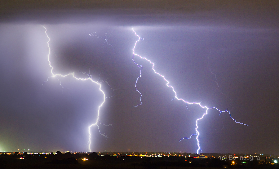 Lightning bolts striking To The Right Right To The Left left. Two images Layered making this 30 sec 250 ISO - f5.6 - 90mm. C 2011 James Bo Insogna