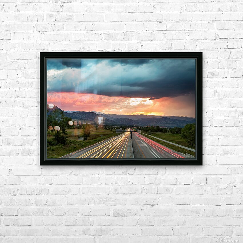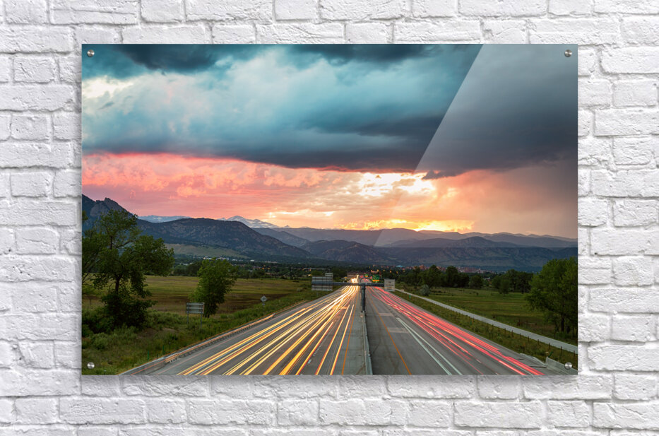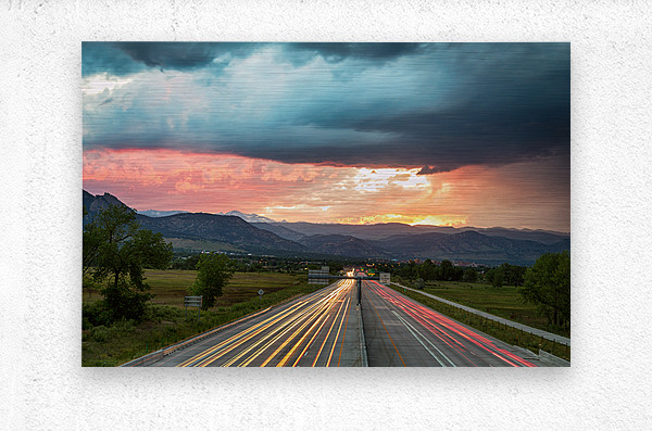 A scenic landscape view of highway 36 cars and neon lights coming into Boulder Colorado with one of the many majestic sunset. Photo: © James Bo Insogna