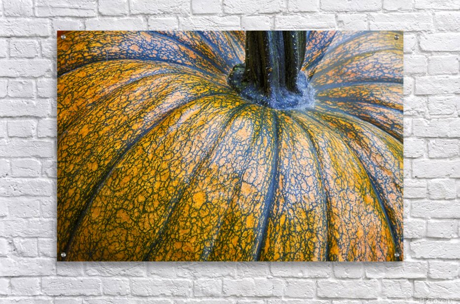 Close-up fine art photograph of a vibrant orange pumpkin showcasing its rich textures and natural patterns. This striking food and nature photography print makes a beautiful piece of wall art for kitchens dining rooms or seasonal home d?cor. Available as fine art prints canvas acrylic metal or framed wall art with worldwide shipping.