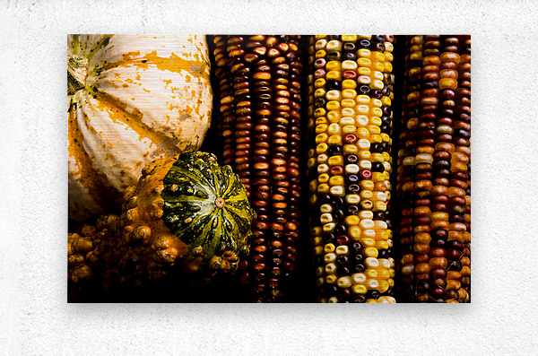 An enchanting fine art photograph capturing the rich textures and colors of a fall harvest. The image features the intricate patterns of Indian corn k...[+]