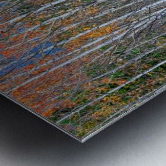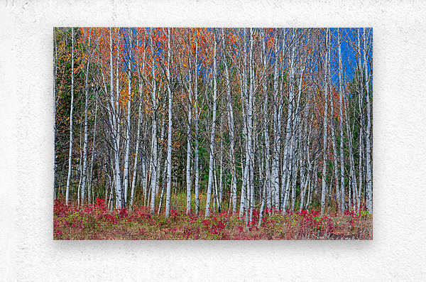 A captivating fine art photograph showcasing a dense aspen grove with its iconic white trunks reaching towards a vibrant blue sky. The scene is alive with the colors of autumn featuring trees adorned with touches of orange and yellow leaves while the forest floor is blanketed in a rich tapestry of red undergrowth and dry grasses. This striking composition offers a beautiful blend of natural patterns and vivid seasonal hues perfect for adding a sense of awe and tranquility to any modern or rustic living space office or gallery.Limited edition.