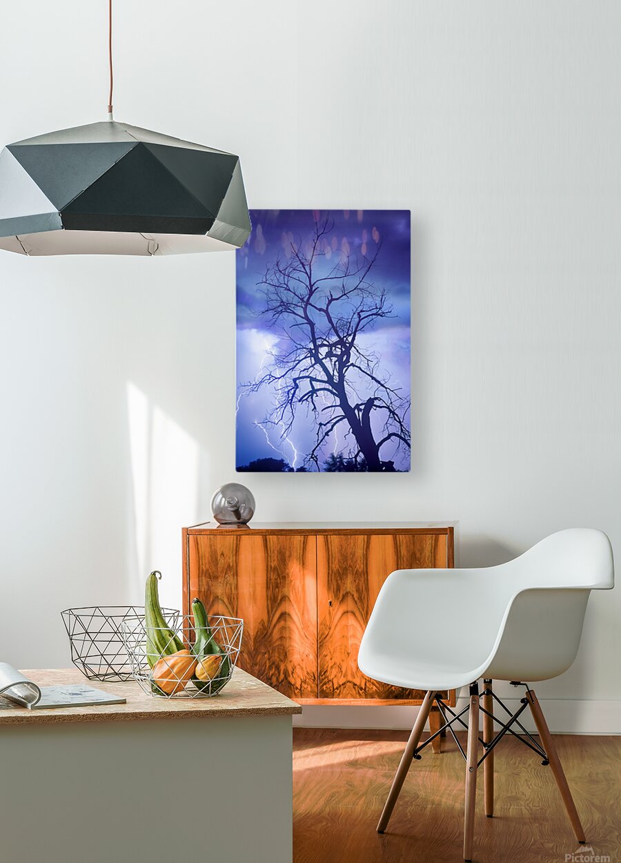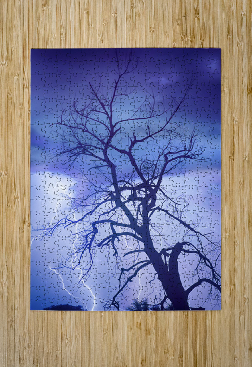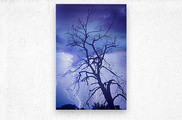 Experience the dramatic power of nature with this limited edition fine art print capturing a spectacular lightning storm under a vivid violet sky over Boulder County Colorado. A lone silhouetted tree its bare branches reaching like skeletal fingers stands as a sentinel against the brilliant flashes creating a scene of raw untamed beauty. Remastered for exceptional clarity and depth this powerful Colorado landscape photography piece is perfect for wall art collectors seeking an atmospheric statement blending the majesty of a mountain storm with the haunting elegance of a twisted tree.