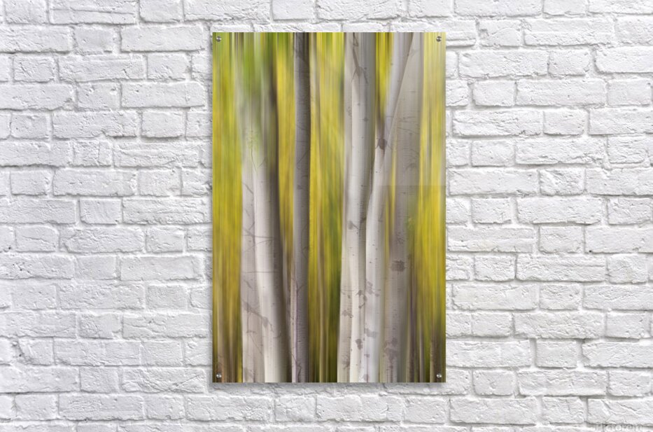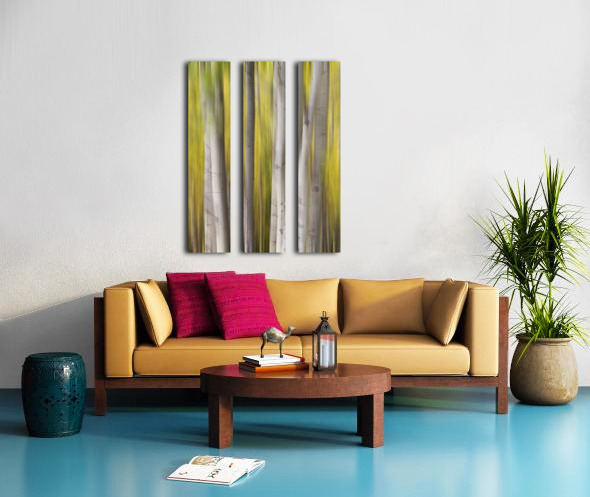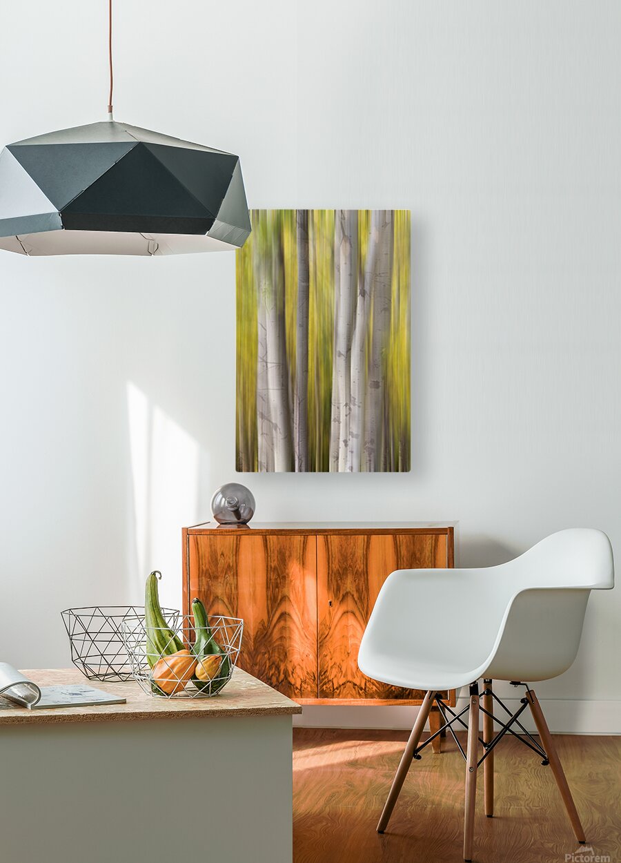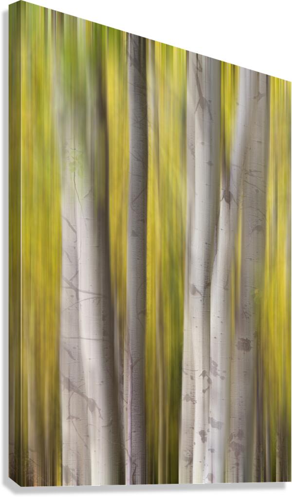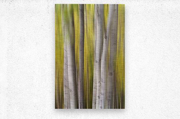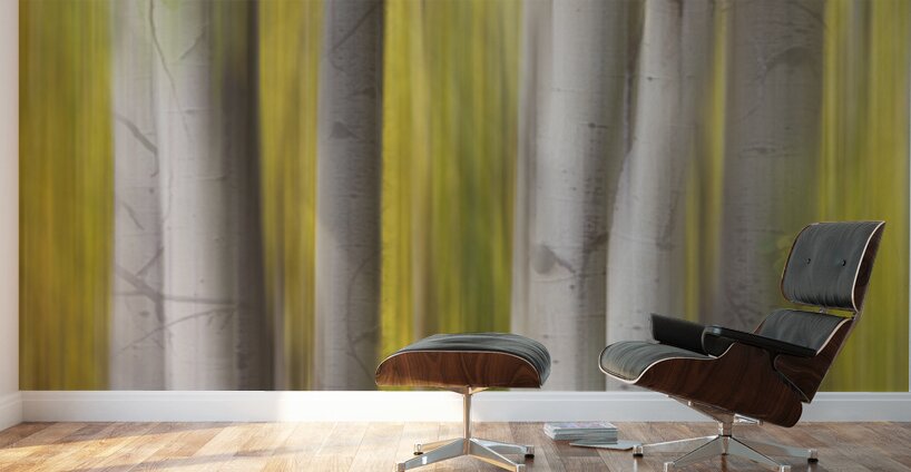 A luminous abstract forest composition where silver-white aspen trunks rise through flowing veils of golden autumn motion creating a tranquil and dreamlike landscape. This fine art photograph blends natural elegance with modern abstraction making it a refined wall art print for contemporary interiors luxury home d?cor gallery walls and curated art collections.
