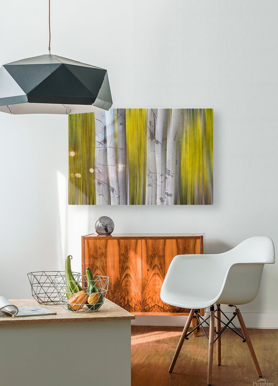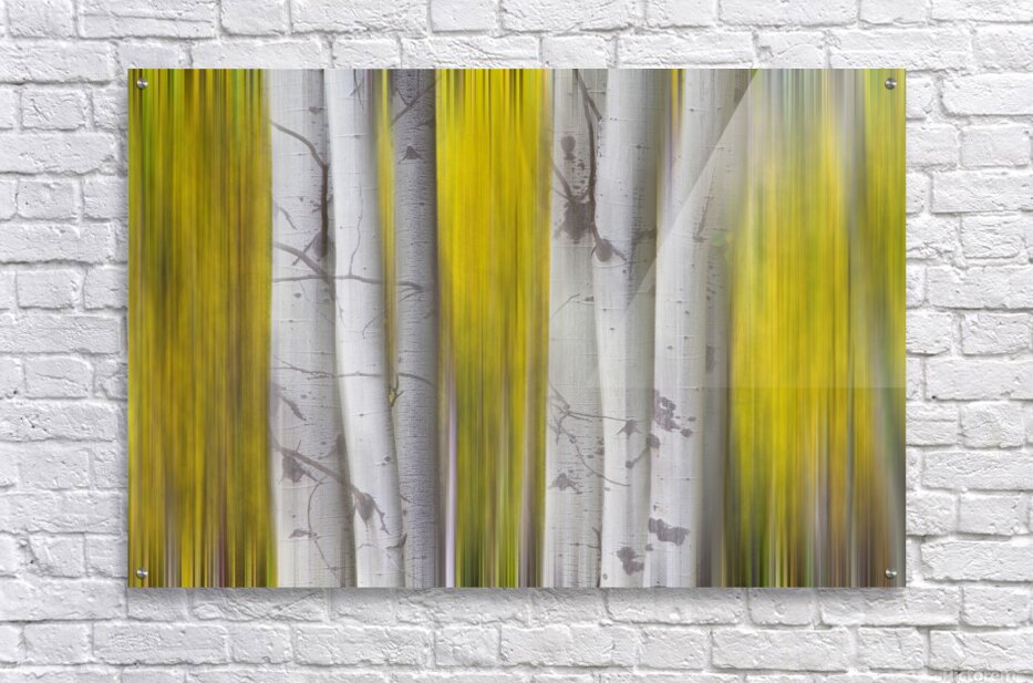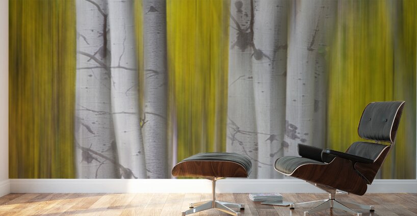 A refined abstract forest composition featuring luminous white aspen trunks layered with flowing ribbons of golden autumn color. This motion-inspired ...[+]