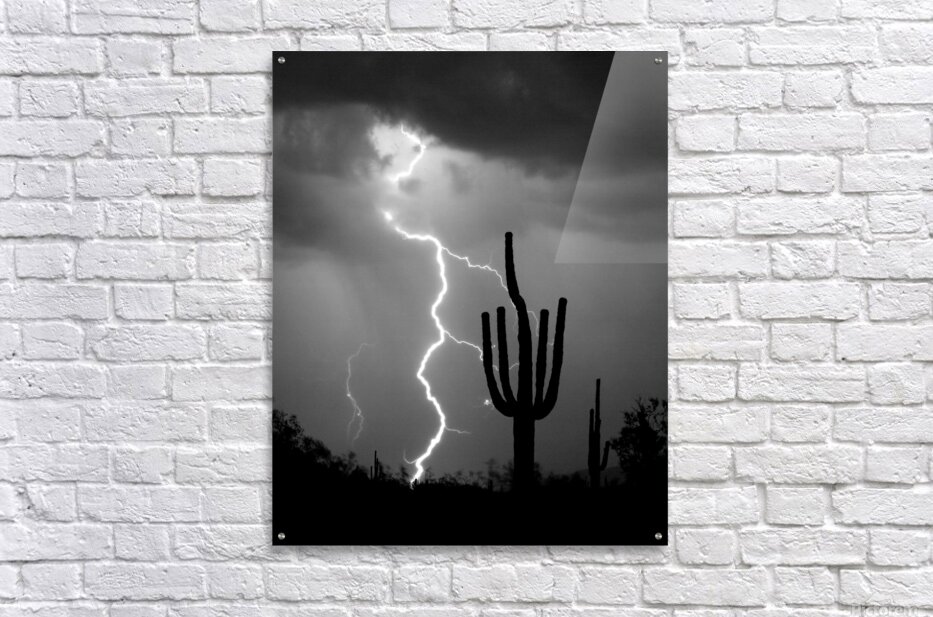 SUR CETTE OEUVRE: BLACK AND WHITE LIGHTNING OVER ARIZONA DESERT SAGUARO