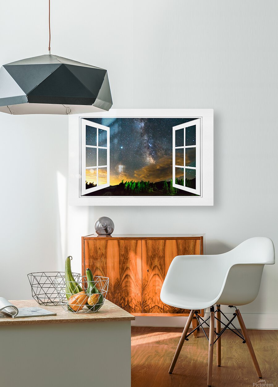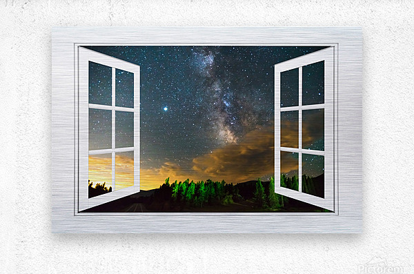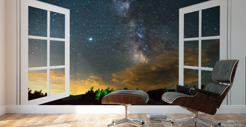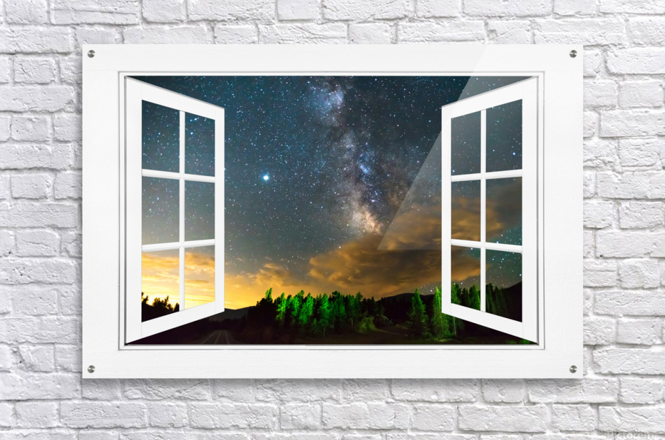 Colorful Milky Way rising out of the clouds above wilderness forest trees view through an open white picture window frame. A fantasy fine art photography window optical illusion into a beautiful colorful lake view. A fantastic window to have in a bedroom, basement, office, or kitchen for a room with a view. Bring nature indoors now you can add a window with a view to any room in your home or office with our picture window frame fine art striking photography nature landscape art prints. The IMAGE is the FRAME how cool is that! Question: Do you have a home or office room without any windows? Do you want to set the mood in a room decor? Do you dream of a room with a view? The Answer: Now you can have a window with a view in any room with our NEW picture window frame tm fine art striking photography nature landscape prints all with a view and ready to hang by photographer James Bo Insogna This is an incredible way to decorate your office walls home walls cafe restaurant boardroom waiting room trade booth corporation or almost any commercial space. Museum-quality art with fast secure worldwide shipping to your door.