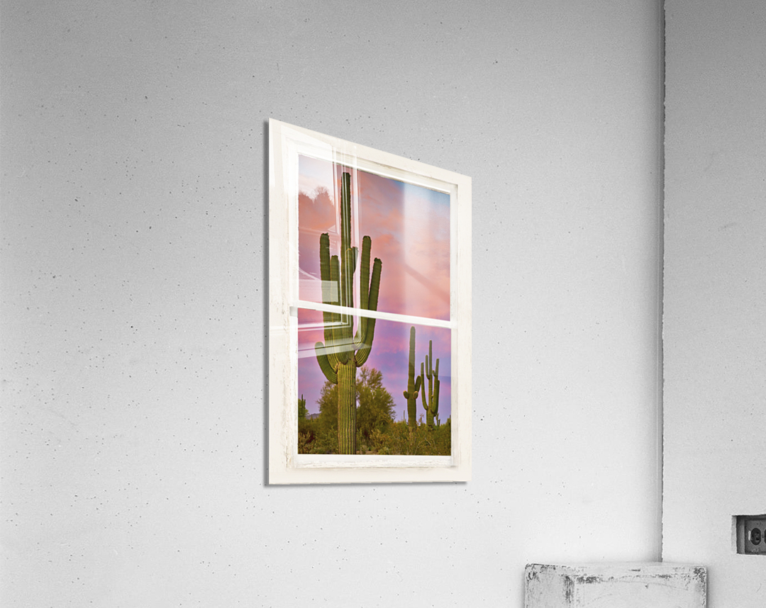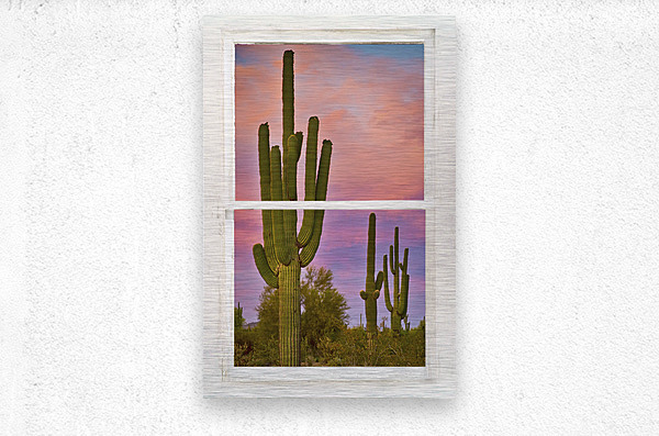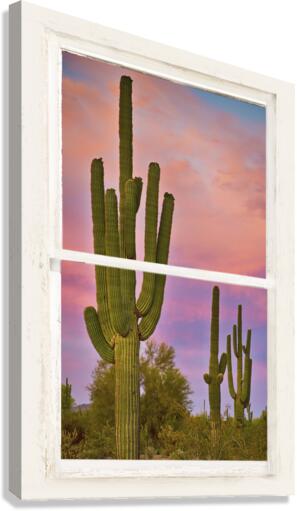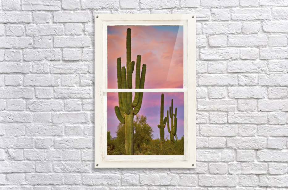 Colorful southwest desert landscape with giant saguaro cactus and colorful sunset sky view through a white distressed rustic picture window. Your very own private window view into the beautiful southwest. A colorful southwest sunset over the lush Sonoran desert with giant saguaro cactus and a view through a classic white distressed rustic picture window. Your very own private window view into the beautiful southwest. Create a fine art photography optical illusion to your d?cor of the beautiful colorful southwest desert with a view through an old distressed rustic barn window . Bring nature indoors now you can add a window with a view to any room in your home or office with our picture window frame nature landscape art prints. The IMAGE is the FRAME how cool is that! Do you have a home or office room without any windows? Do you want to set the mood in a room decor? Do you dream of a room with a view? Now you can have a window with a view in any room with our picture window frame fine art striking photography nature landscape available as a poster prints canvas wrap acrylic fine art prints and metal prints all with a view and ready to hang by photographer James Bo Insogna C All Rights Reserved. This is an incredible way to decorate your window less office walls home walls cafe restaurant boardroom waiting room trade booth corporation or almost any commercial space. *PLEASE NOTE : The Window Frame is part of the image. It is recommended ordering as an Acrylic Print - Metal Print - or Stretched Canvas Wrap with white sides. **PLEASE NOTE WATERMARKS WILL NOT BE ON THE PURCHASE PRINTS*