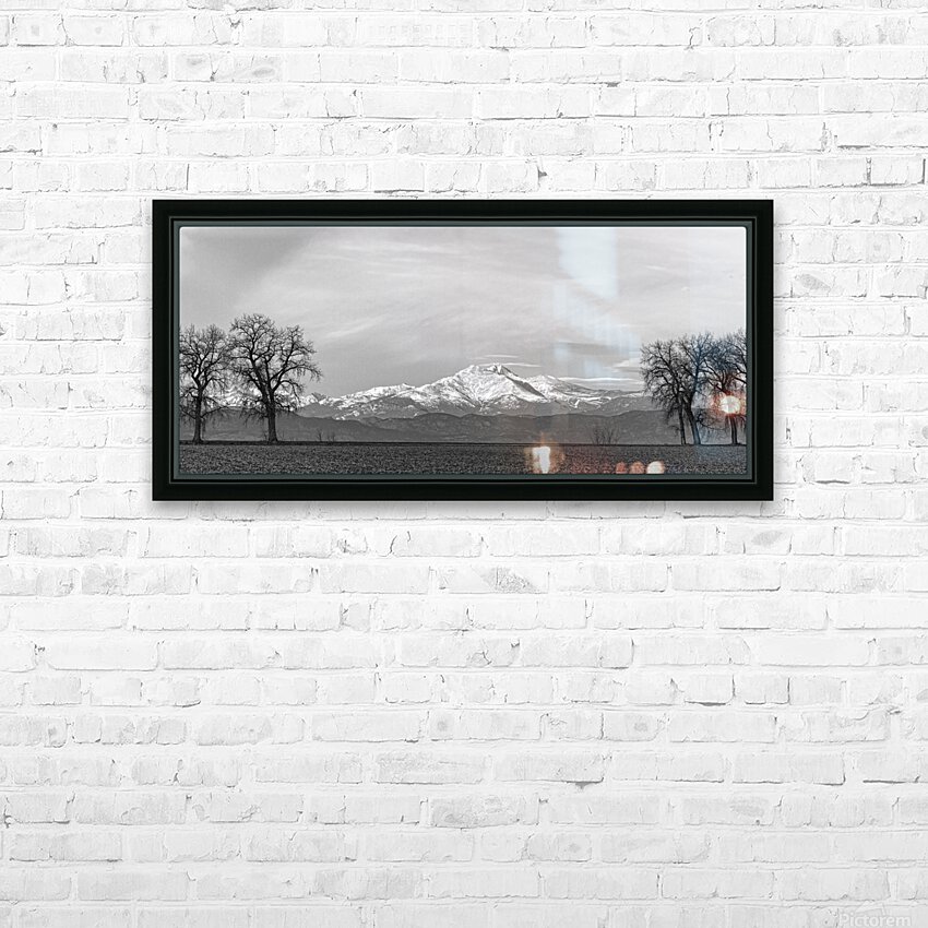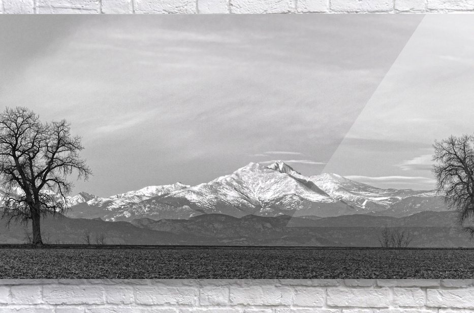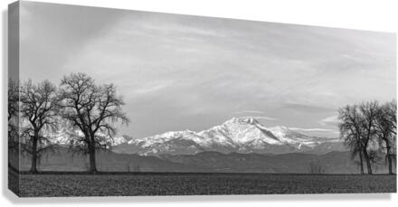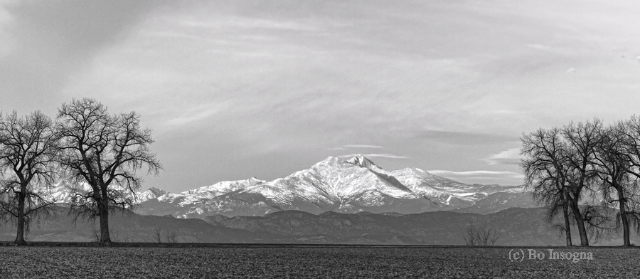 The majestic snow-capped Colorado Rocky Mountains Twin Peaks Mt Meeker 13,911 feet and Longs Peak 14,256 feet country scenic view between the trees on the farm fields looking west. Panorama Crop. Black and White Colorado Fine art nature landscape photography images by James Bo Insogna - All Rights Reserved. *PLEASE NOTE WATERMARKS WILL NOT BE ON THE PURCHASE PRINTS*