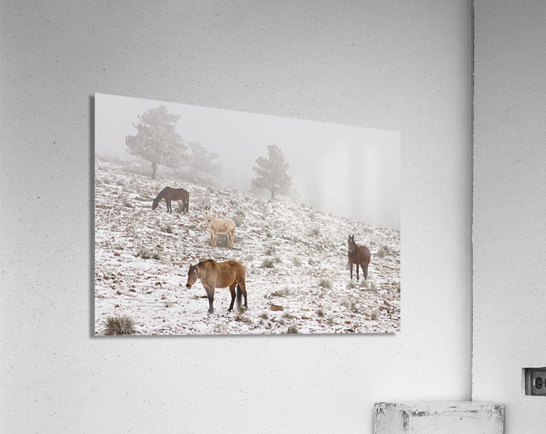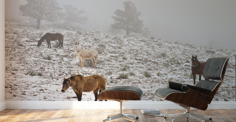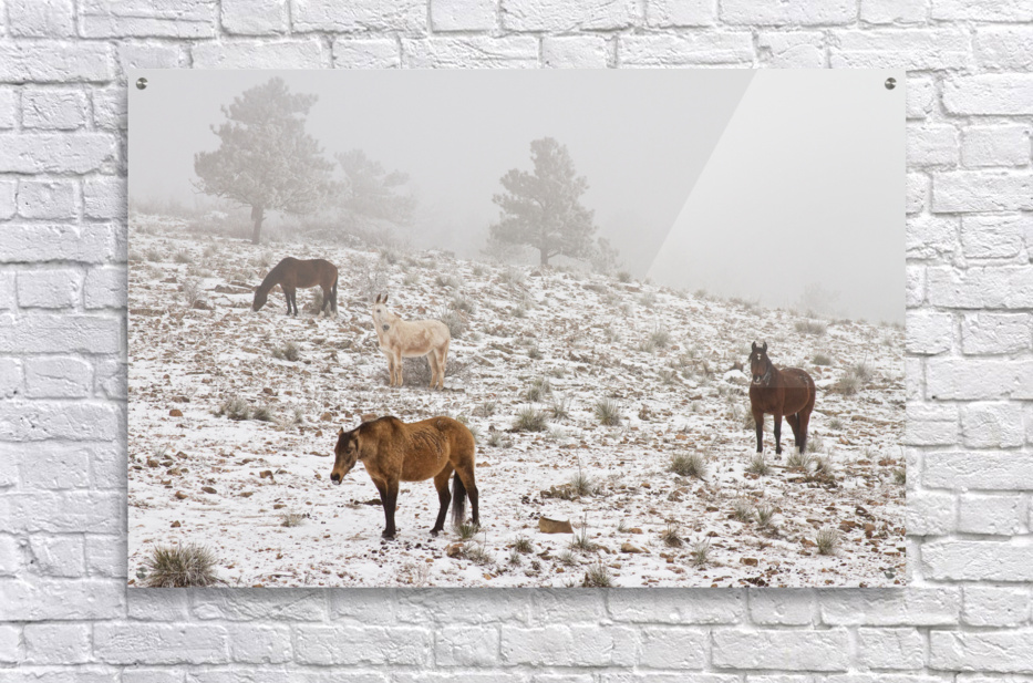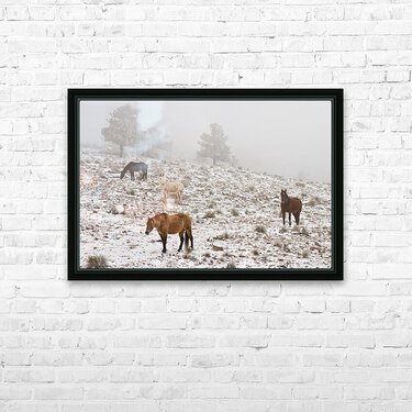 Pour obtenir "Rocky Mountain Horses Snow Fog" dans une impression encadrée.