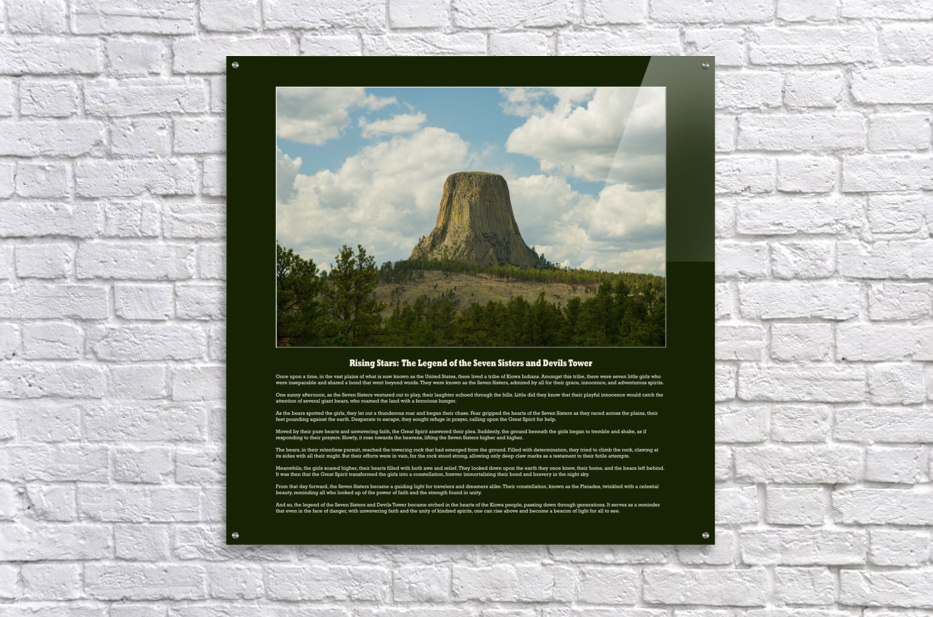 There are a couple stories about Devils Tower. This in my favorite. Once upon a time in the vast plains of what is now known as the United States there lived a tribe of Kiowa Indians. Amongst this tribe there were seven little girls who were inseparable and shared a bond that went beyond words. They were known as the Seven Sisters admired by all for their grace innocence and adventurous spirits. One sunny afternoon as the Seven Sisters ventured out to play their laughter echoed through the hills. Little did they know that their playful innocence would catch the attention of several giant bears who roamed the land with a ferocious hunger. As the bears spotted the girls they let out a thunderous roar and began their chase. Fear gripped the hearts of the Seven Sisters as they raced across the plains their feet pounding against the earth. Desperate to escape they sought refuge in prayer calling upon the Great Spirit for help. Moved by their pure hearts and unwavering faith the Great Spirit answered their plea. Suddenly the ground beneath the girls began to tremble and shake as if responding to their prayers. Slowly it rose towards the heavens lifting the Seven Sisters higher and higher. The bears in their relentless pursuit reached the towering rock that had emerged from the ground. Filled with determination they tried to climb the rock clawing at its sides with all their might. But their efforts were in vain for the rock stood strong allowing only deep claw marks as a testament to their futile attempts. Meanwhile the girls soared higher their hearts filled with both awe and relief. They looked down upon the earth they once knew their home and the bears left behind. It was then that the Great Spirit transformed the girls into a constellation forever immortalizing their bond and bravery in the night sky. From that day forward the Seven Sisters became a guiding light for travelers and dreamers alike. Their constellation known as the