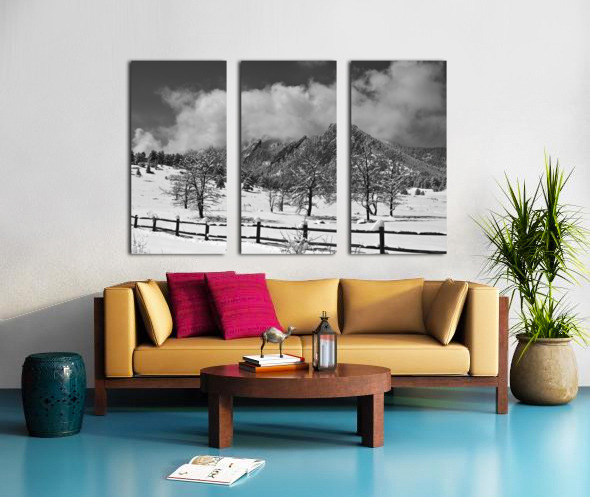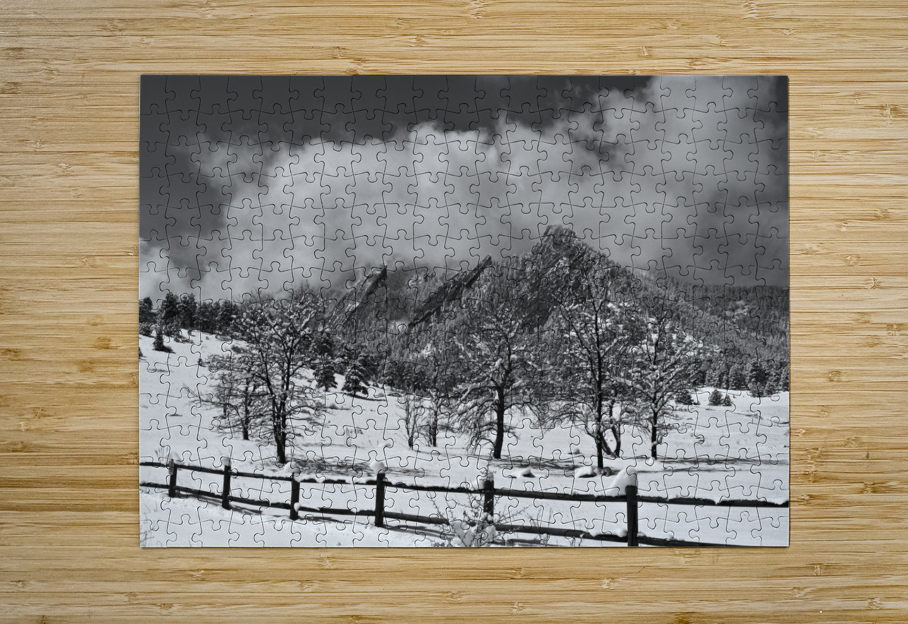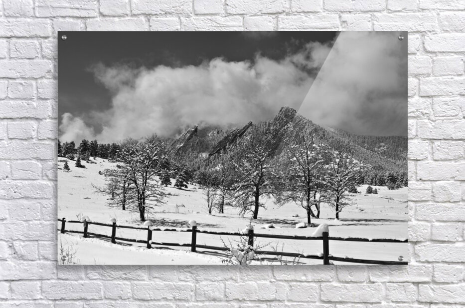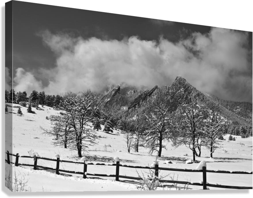 A scenic landscape view of the Boulder Colorado Flatirons in black and white with trees and a rustic fence after a nice 13 inch dusting of snow with low hanging clouds. Black and white Colorado Fine art nature landscape photography poster prints decorative canvas prints acrylic prints metal prints greeting cards and stock images by James Bo Insogna C - All Rights Reserved. *PLEASE NOTE WATERMARKS WILL NOT BE ON THE PURCHASE PRINTS* Perfect fine art photography for the home decor Office decor or as a gift to a friend or love one. Order Striking Fine Art Photography by James Bo Insogna as fine art posters print canvas art metal art prints acrylic prints and framed art at the on-line gallery you can custom your print size mat framed or unframed delivered to your door with fast secure shipping to decorate your home and office or a gift to a friend or love one.