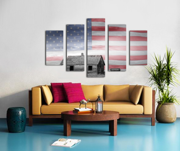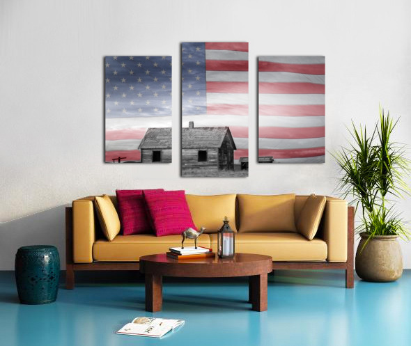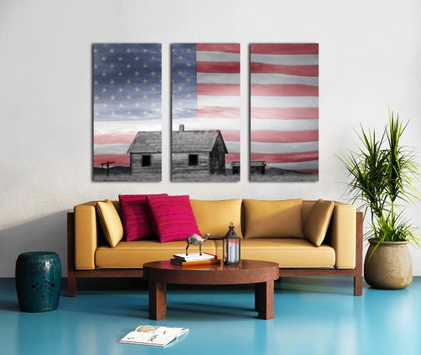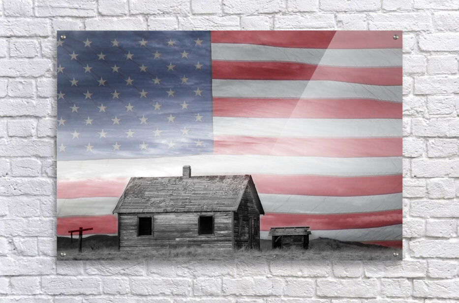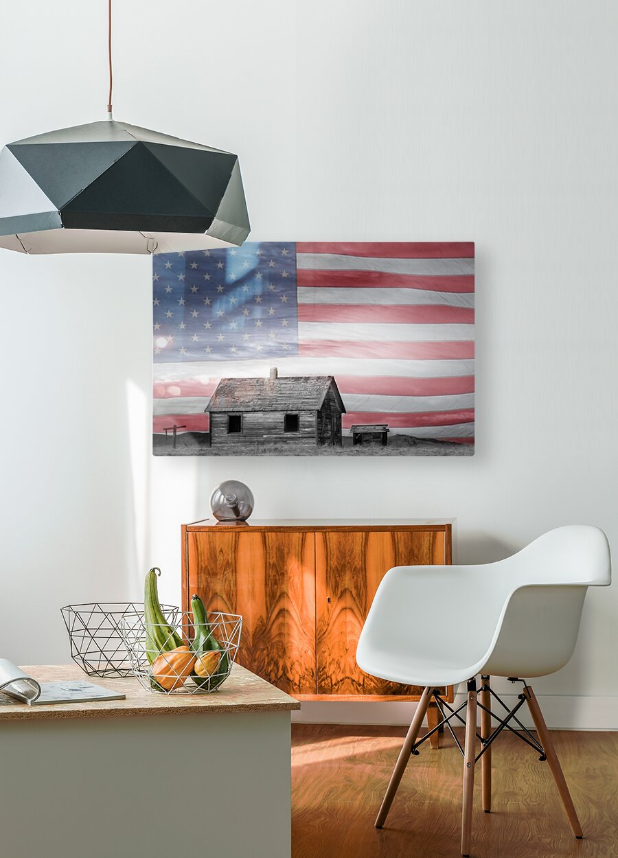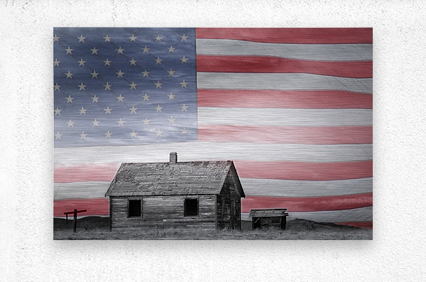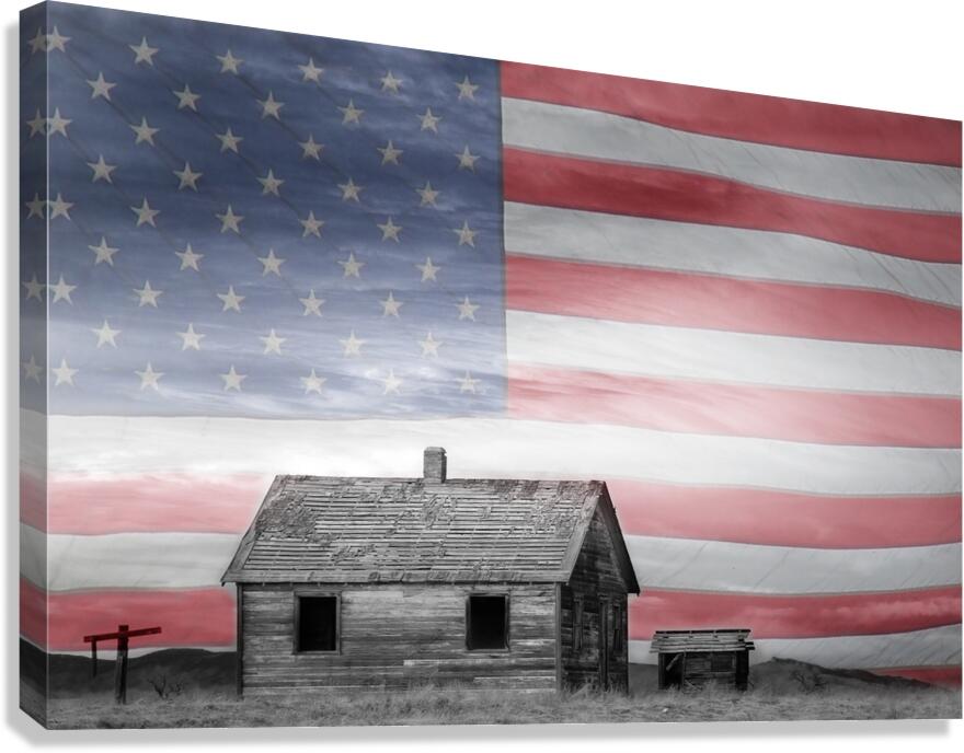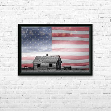 A rustic rural little country house on the prairie with a USA Flag background. Striking fine are nature landscape black and white selective color photography print canvas art and stock image by James Bo Insogna Copyright C 2012 - All Rights Reserved 1-888-682-0122. Fine Art Guaranteed to liven any decor. Great to decorate your home walls office walls cafe restaurant boardroom waiting room or almost any commercial space.