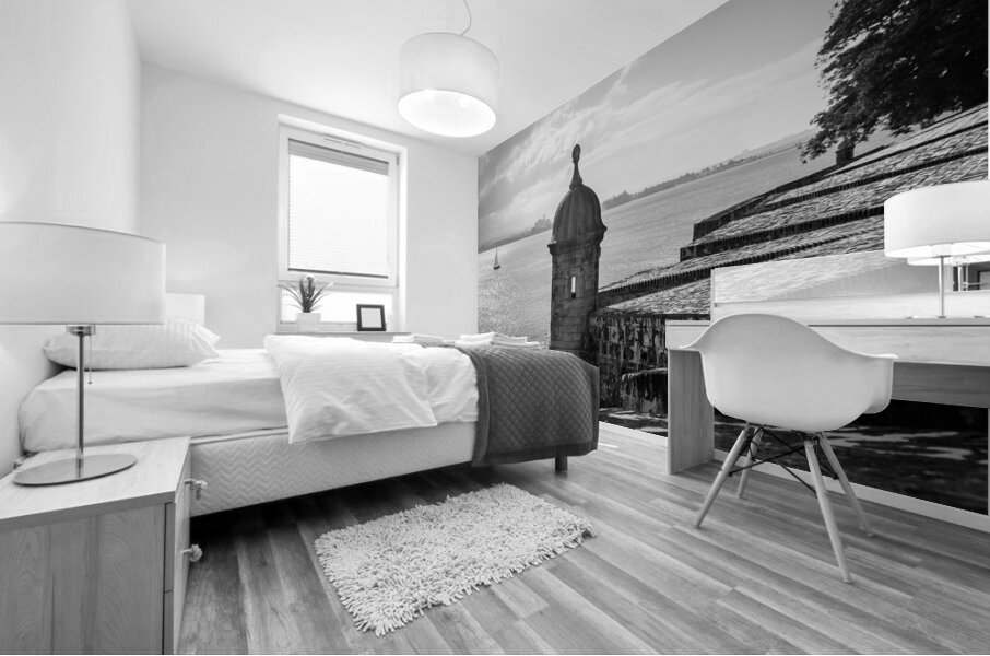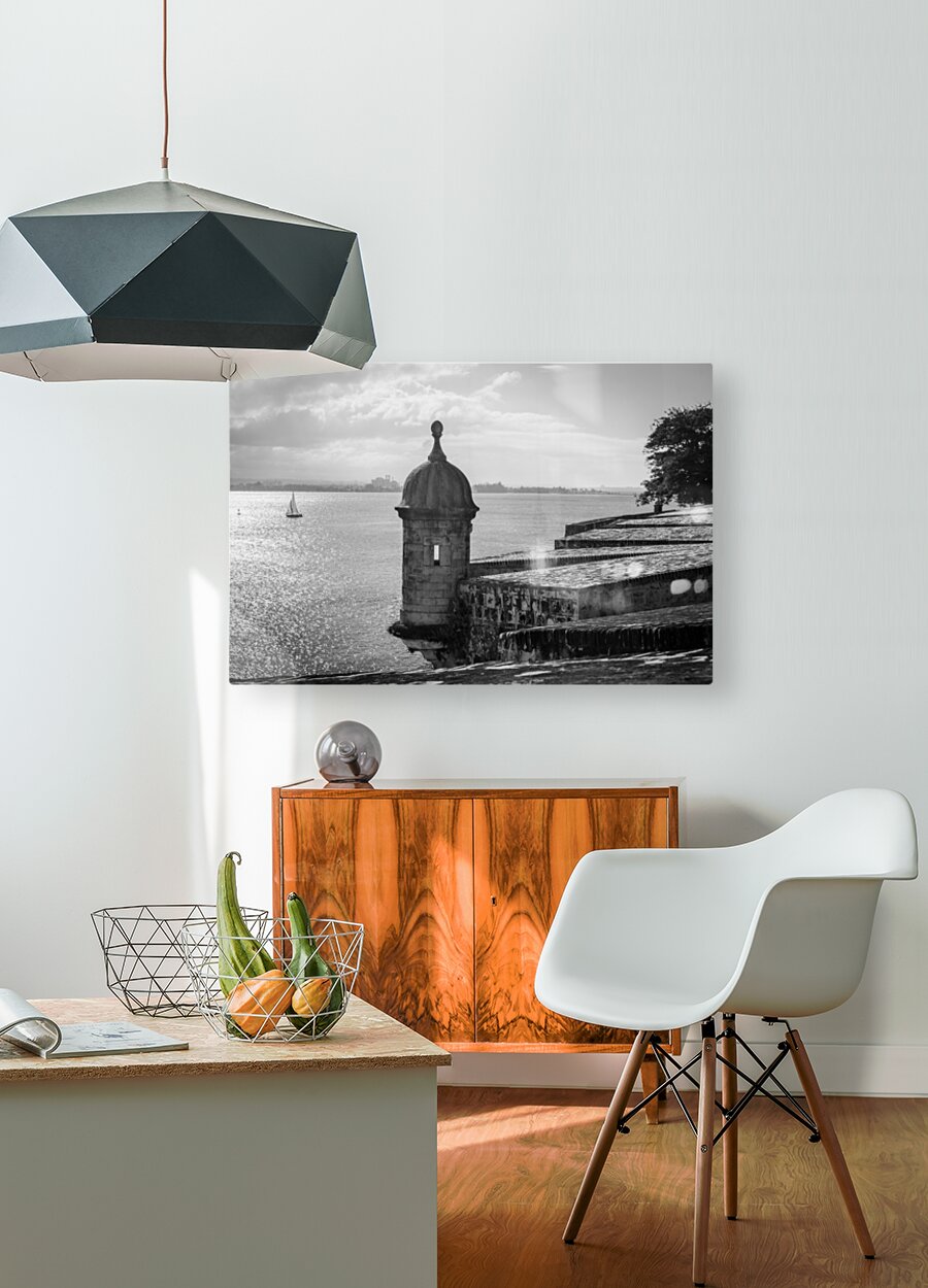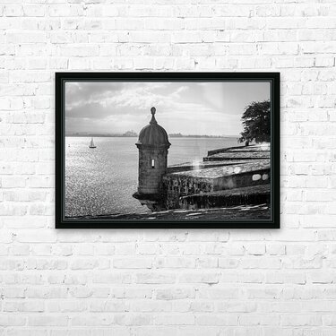In this captivating black and white fine art photograph a timeless scene unfolds in San Juan Puerto Rico. The lens gazes out over a textured stone wall capturing the intricate details of the weathered surface. The monochromatic palette enhances the dramatic play of light and shadow on the aged textures imparting a sense of history and artistic depth. Against the textured backdrop an ancient guard tower stands sentinel its silhouette rising above the citys fortifications. The black and white treatment emphasizes the architectural details evoking a sense of nostalgia and highlighting the enduring beauty of the historic structure. The tower commands attention as it overlooks the bay a symbol of resilience against the passage of time. Beyond the fortified walls the expansive bay unfolds in shades of gray creating a harmonious blend of sea and sky. A lone sailboat captured in elegant contrast glides across the monochrome waters its form adding a touch of tranquility to the scene. This black and white fine art photograph invites viewers to appreciate the timeless elegance of San Juans historical and maritime heritage combining texture history and the enduring allure of the coastal city in a captivating visual composition.