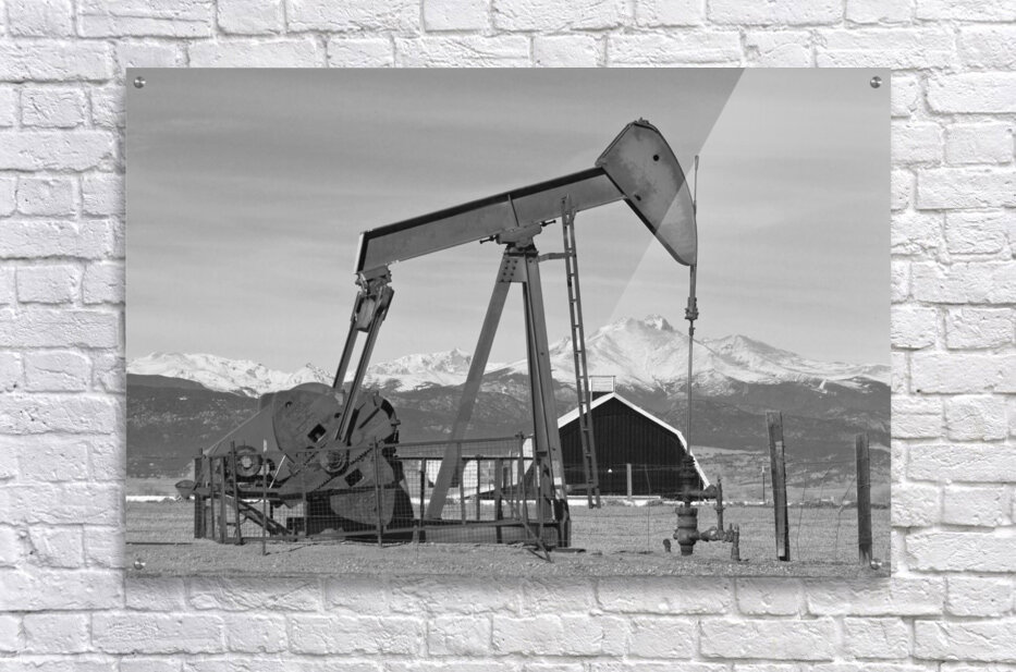 Get this artwork "Oil Well Pumpjack Red Barn and Longs Peak BW" in a framed print.