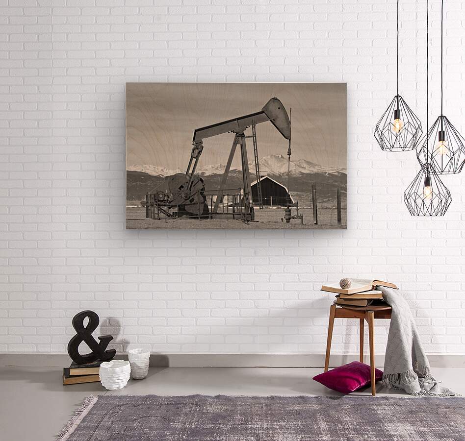 ABOUT THIS ARTWORK: OIL WELL PUMPJACK RED BARN AND LONGS PEAK BW