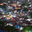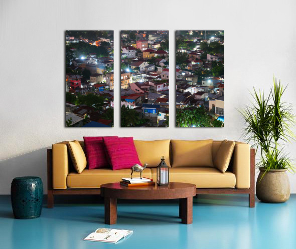 This fine art night photograph captures the intimate charm of a densely populated urban neighborhood at twilight. The image taken from an elevated perspective reveals a patchwork of rooftops and dwellings bathed in the warm scattered light of street lamps and home interiors. The scene is a symphony of textures from the corrugated metal roofs to the lush foliage peeking through the built environment. The deliberate focus on the interplay of light and shadow creates a sense of depth and invites the viewer to explore the stories hinted at within this vibrant community. The soft ambient light lends a painterly quality to the scene highlighting the beauty found in the everyday urban landscape.