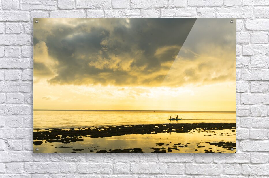 This captivating nature landscape photograph captures the serene beauty of fishermen gliding across the ocean at sunrise on Negros Island Philippines. The golden hues of dawn paint the sky and sea in a warm embrace while dramatic clouds loom above casting an ethereal glow over the tranquil waters. Gentle ripples reflect the morning light creating a sense of peace and timelessness. This image is a poetic tribute to the quiet strength of fishermen and the endless rhythm of the sea.