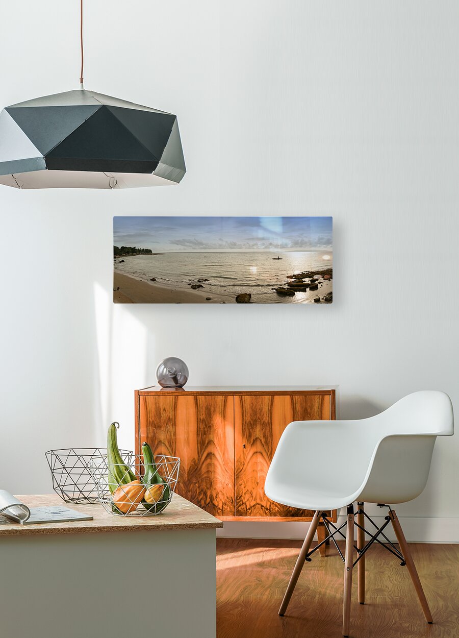 This expansive seaside beauty 11-image gigapixel panoramic A7R photograph captures the serene shoreline of Negros Oriental Philippines. The golden sunlight reflects off the calm ocean waves as a small boat drifts in the distance creating a peaceful and dreamy coastal scene. Scattered rocks along the sandy shore add depth and texture while the soft sky enhances the tranquil atmosphere of this tropical paradise.