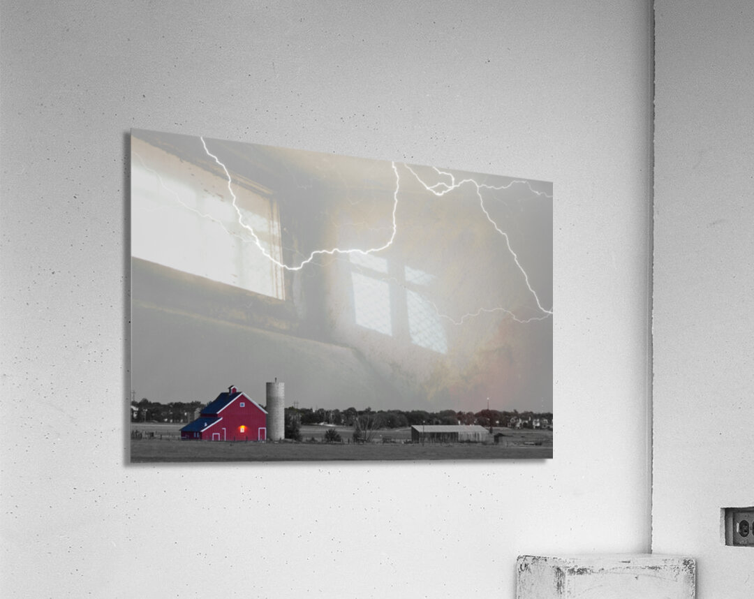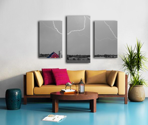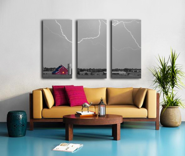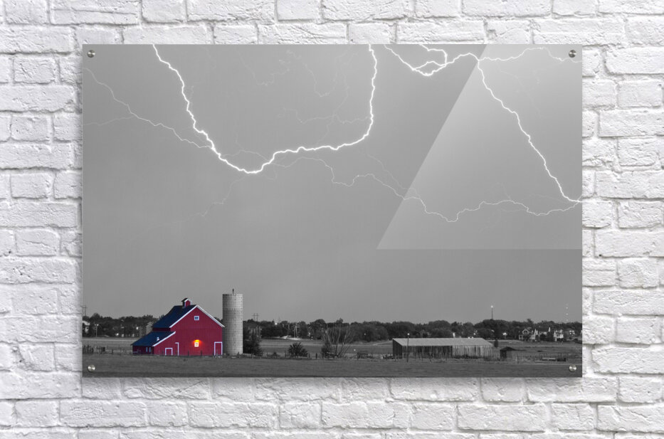 Cloud to cloud lightning striking above a Red Barn at McIntosh Farm and museum open space in Longmont Colorado Boulder County. This storm came in fast and left the same way heading to the northeast out toward Ft Collins and Greeley. There were some really cool C2C strikes. Missed a couple good ones as the strikes were far apart. Settings for this shot: ISO 100 - 4sec - f8 - 70mm. Black and white with selective coloring. Fine art nature landscape photography prints decorative canvas prints acrylic prints and stock images by By James Bo Insogna C 2012 - All Rights Reserved. 1-888-682-0122