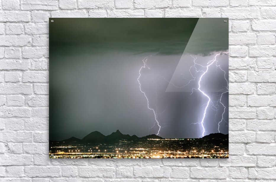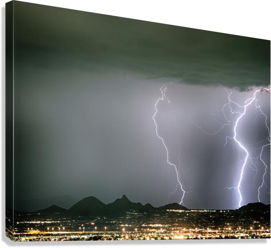 A view of scenic North Scottsdale Arizona all the way up to Pinnacle Peak and Reata Pass. Lightning is hitting the desert floor around Reata Pass area from some very high thunderstorm monsoon clouds above. Lightning can occur with either positive or negative polarity negative is more common but positive lightning can carry ten times more current. In either case the amount of voltage depends on the length of the bolt - the longer the bolt the higher the voltage. Cloud-to-ground lightning bolts are a common phenomenon about 100 strike Earth?s surface every single second yet their power is extraordinary. Each bolt can contain up to one billion volts of electricity. Lightning can heat the surrounding air to thousands of degrees. This causes the air to expand rapidly which generates a supersonic shock wave that as it dissipates becomes an acoustic wave we hear as thunder. Photo: ? James Bo Insogna