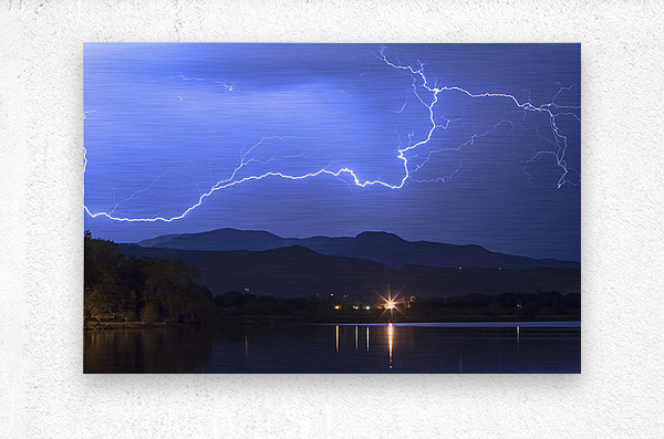 One long lightning bolt strike acr4oss the sky above McIntosh Lake in Longmont Colorado with a western view to th foothills of the Rocky Mountains. Li...[+]