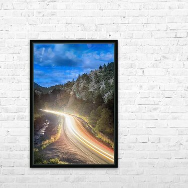 Boulder Canyon Neon Light Long exposure of a dusk night time portrait scenic view of car light trails blazing up and down the Boulder Canyon with a few stars in the sky. Boulder County Colorado. Boulder Canyon is Carved by the rushing waters of Middle Boulder Creek popular for scenic driving fishing and rock climbing. Land in this area is a mix of city county national forest and private lands. 18 miles from Boulder Population: 98889 Altitude elevation:5430 feet up to Nederland Population: 1337 Altitude elevation: 8230 feet . Boulder Creek is a 31.4-mile-long creek draining the Rocky Mountains to the west of Boulder Colorado as well as the city itself and surrounding plains. Middle Boulder Creek rises as two forks from the Continental Divide: the North Fork rises in a cirque below Mount Neva and flows 7.5 miles to the South Fork The South Fork rises at Rollins Pass on the Continental Divide and flows 5.5 miles to the North Fork. From the junction of the two forks Middle Boulder Creek 13.7 miles long flows east through the towns of Eldora and Nederland into Barker Meadow Reservoir a water supply for the city of Boulder before joining North Boulder Creek to form the main stem of Boulder Creek. Colorado Fine art nature landscape photography poster prints decorative canvas prints acrylic prints metal prints corporate artwork greeting cards and stock images by James Bo Insogna C - All Rights Reserved. *PLEASE NOTE WATERMARKS WILL NOT BE ON THE PURCHASE PRINTS*