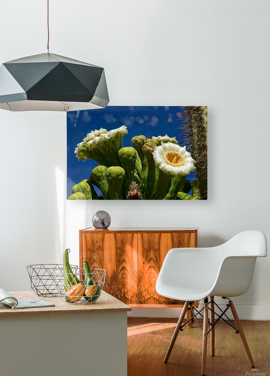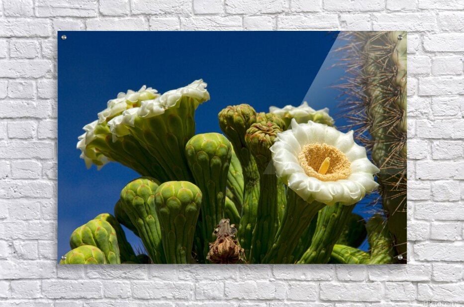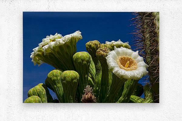 Close-up of saguaro cactus blooms with a deep blue sky of the Arizona desert in the month of May. Fine art nature landscape photography prints canvas ...[+]