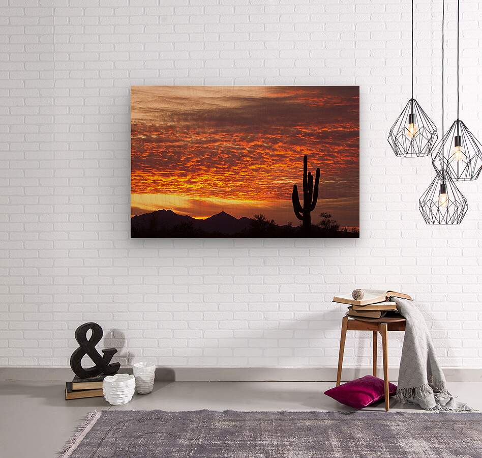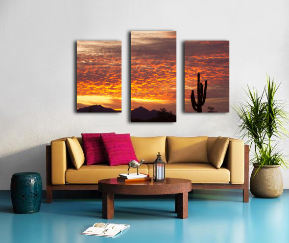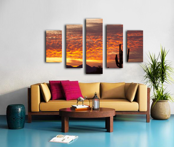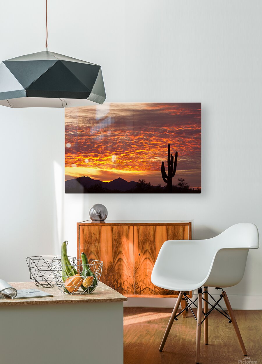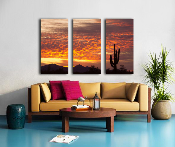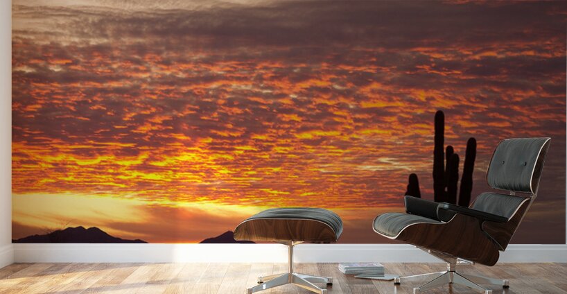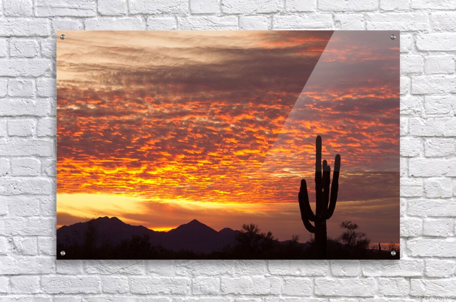 The capture of dawn?s arrival the Arizona sky ignites with waves of fiery orange and soft lavender as the first light spills across the desert. A proud saguaro cactus stands in silhouette framed by distant mountains and whispering mesquite. The sunrise dances on the clouds like brushstrokes on a painter?s canvas bringing warmth to the waking Sonoran landscape?an ode to the quiet grandeur of morning in the Southwest. Beautiful burning sunrise in the Arizona Sonoran Desert with giant saguaro cactus. A fine art southwest nature landscape photography print canvas art and stock image by James Bo Insogna C