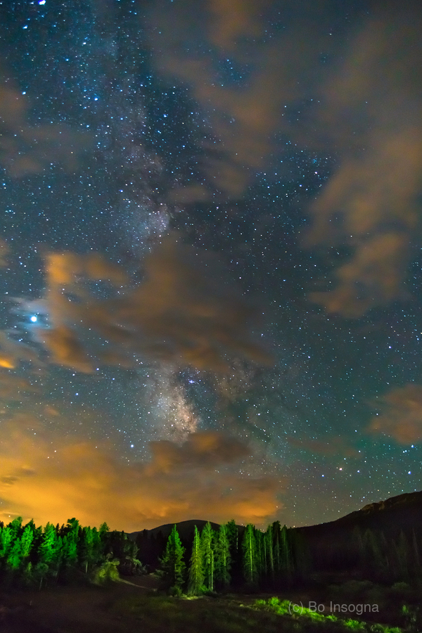 Colorado high country forest pine trees lit up by some nearby lights and the milky way peeking through the clouds. Fine art nature landscape photography images by James Bo Insogna. For more please like subscribe follow and share. Very much appreciated! All artwork and images in this gallery are the original artwork of James Bo Insogna Copyright All Rights Reserved and is protected by US and International Copyright laws.