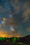 Colorado high country forest pine trees lit up by some nearby lights and the milky way peeking through the clouds. Fine art nature landscape photogr...[+]