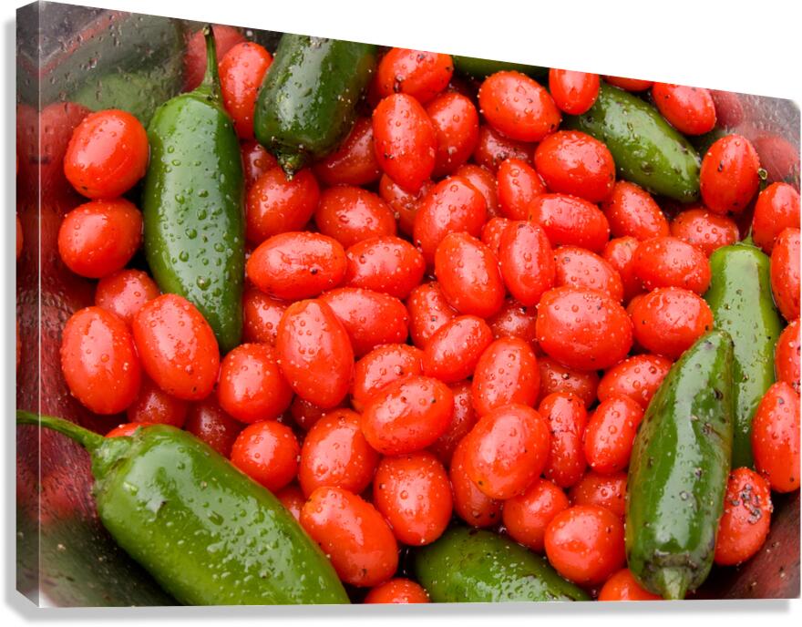 Hot green peppers and red cherry tomatoes done in a pattern in a stainless bowl.An evocative fine art photograph capturing the vibrant dance between natures ruby reds and deep emeralds. This close-up composition features plump glistening cherry tomatoes nestled amongst sleek dark green jalapeno peppers all freshly harvested. The rich textures and contrasting colors create a visually captivating tableau celebrating the bounty of the garden. Ideal for a contemporary kitchen a rustic dining space or as a striking accent in a modern home this piece offers a testament to natural beauty and the simple pleasures of the earths harvest.