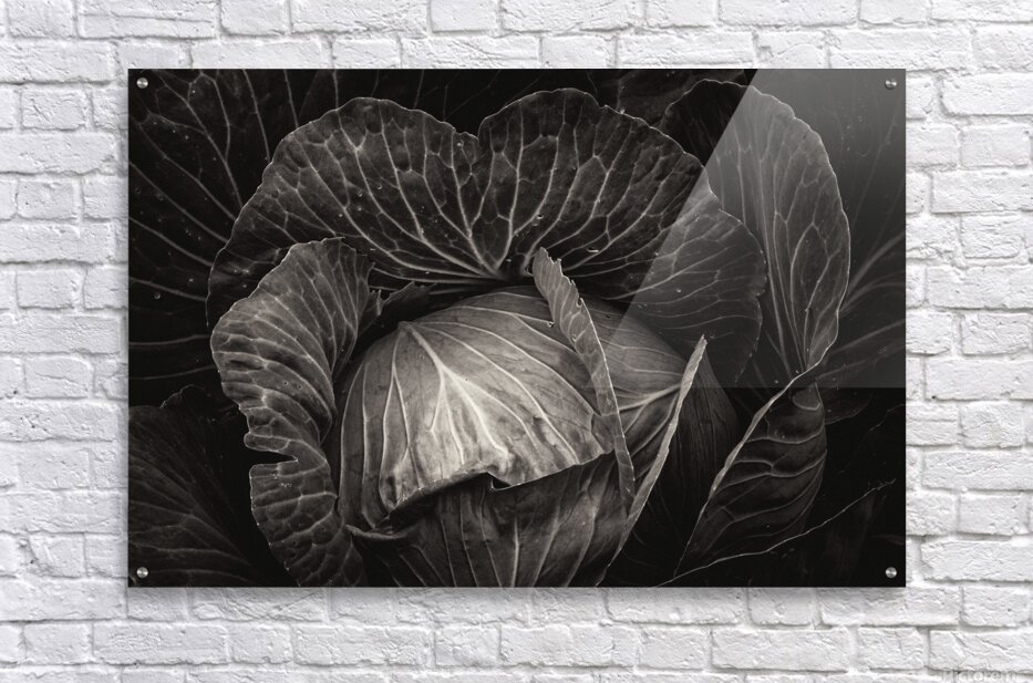An alluring fine art photograph rendered in dramatic black and white that unveils the intricate beauty of a freshly harvested cabbage. The image captures the delicate veining and layered textures of its leaves creating a captivating play of light and shadow. This striking piece transforms the humble vegetable into a sophisticated work of art perfect for adding a touch of organic elegance and minimalist charm to a modern kitchen a contemplative living space or a gallery wall seeking understated beauty.