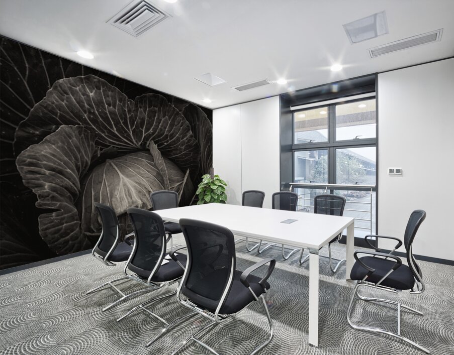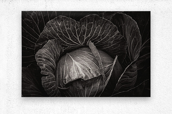 An alluring fine art photograph rendered in dramatic black and white that unveils the intricate beauty of a freshly harvested cabbage. The image captures the delicate veining and layered textures of its leaves creating a captivating play of light and shadow. This striking piece transforms the humble vegetable into a sophisticated work of art perfect for adding a touch of organic elegance and minimalist charm to a modern kitchen a contemplative living space or a gallery wall seeking understated beauty.