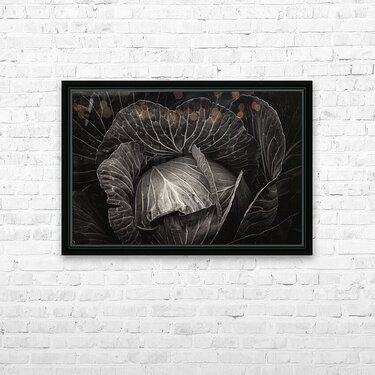 An alluring fine art photograph rendered in dramatic black and white that unveils the intricate beauty of a freshly harvested cabbage. The image captu...[+]