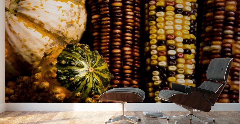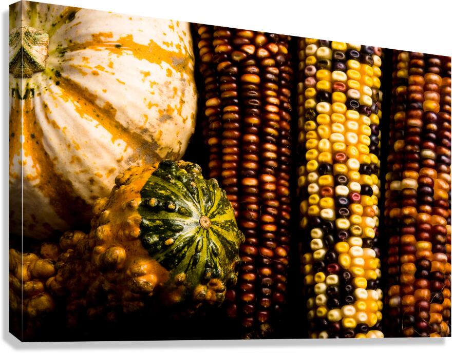 An enchanting fine art photograph capturing the rich textures and colors of a fall harvest. The image features the intricate patterns of Indian corn k...[+]
