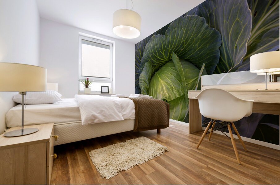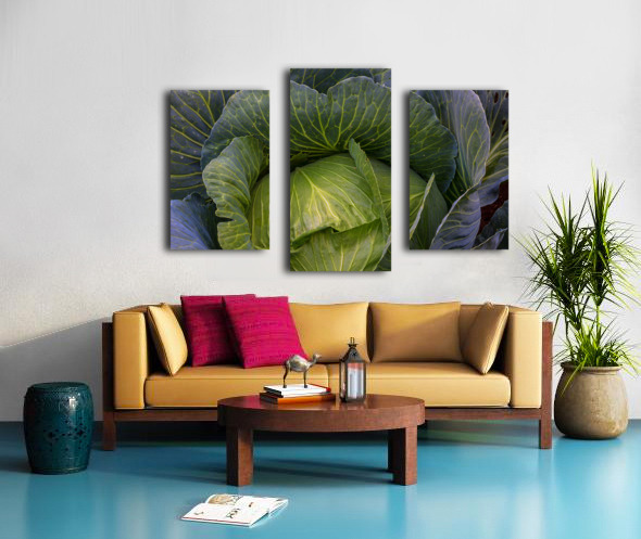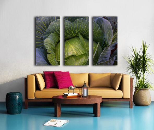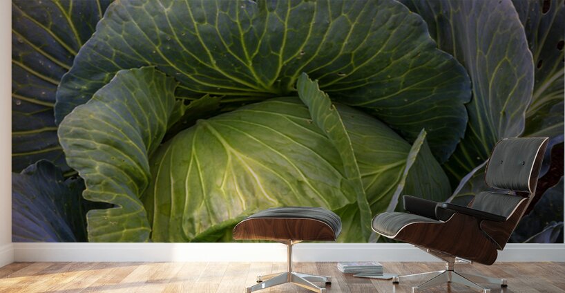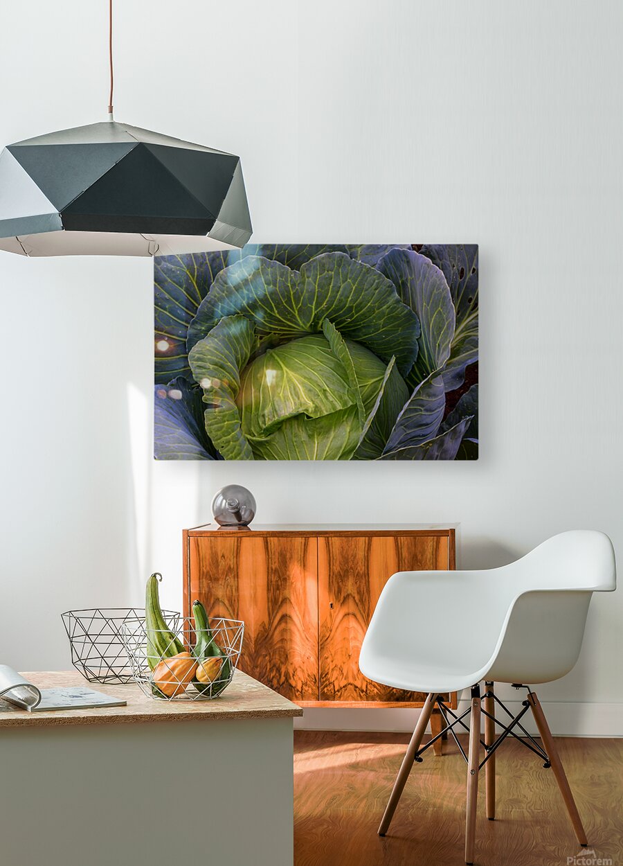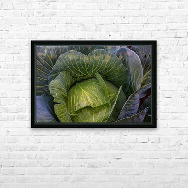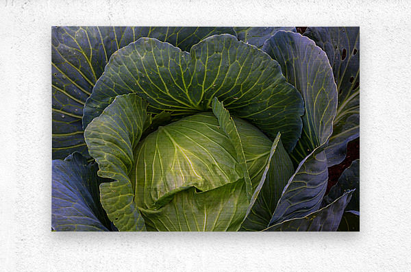 A captivating fine art photograph revealing the lush intricate beauty of a vibrant green cabbage. The image highlights the detailed network of veins across its broad curving leaves and the subtle purple hues hinting at its depth creating a rich tapestry of natural texture and form. This piece celebrates the organic artistry found in the garden bringing a fresh grounding presence to any kitchen dining area or living space. A perfect choice for those who appreciate the subtle elegance of natures design. Limited Edition.