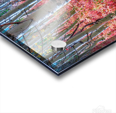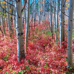 An enchanting fine art photograph capturing the breathtaking beauty of an aspen forest bathed in the vibrant hues of autumn. Slender silvery-white aspen trunks rise gracefully from a dense fiery red carpet of undergrowth creating a dramatic and immersive landscape. The soft dappled light filters through the canopy enhancing the brilliant fall colors and evoking a sense of tranquil wonder. This captivating piece offers a vivid glimpse into natures seasonal artistry perfect for bringing the serene majesty of an autumnal woodland into any living space office or gallery.