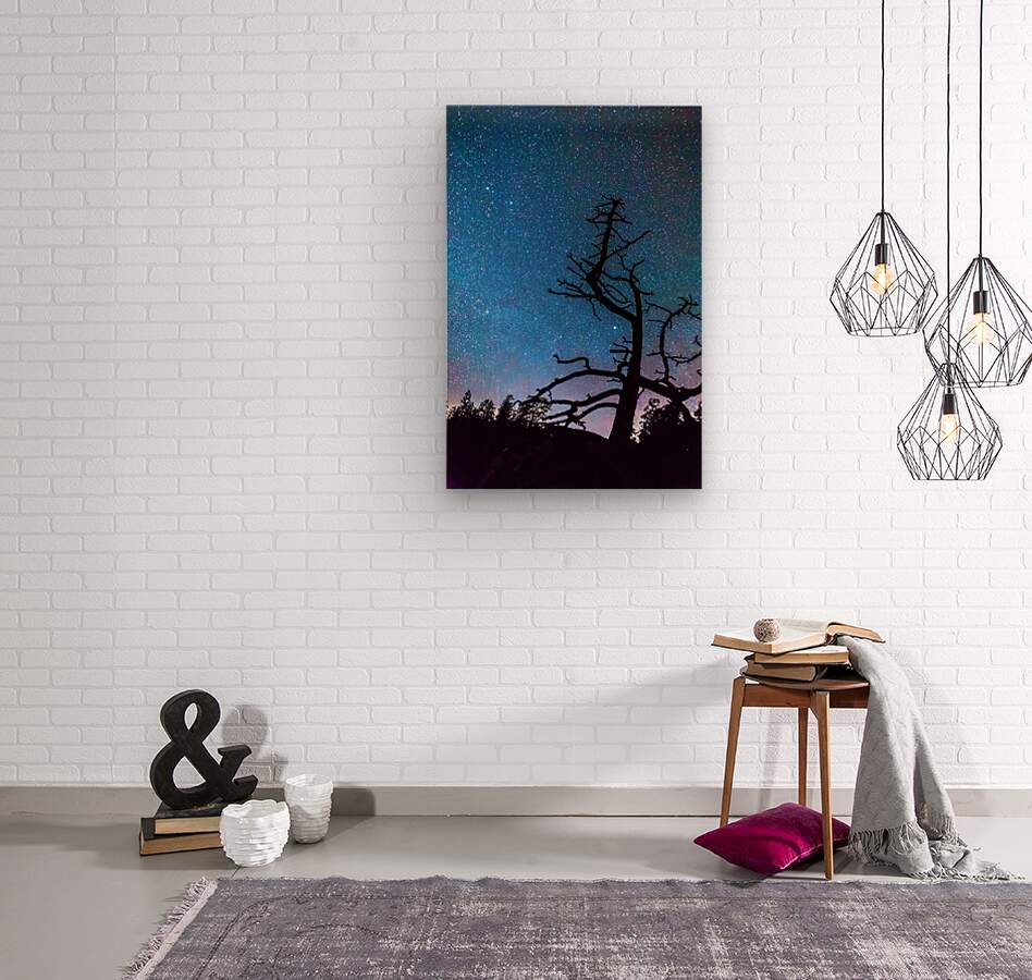 A poetic vision of the night sky filled with endless stars where the silhouette of a lone tree reaches toward the heavens. This fine wall art captures the stillness and wonder of the cosmos bringing the quiet beauty of starlight into your living space.