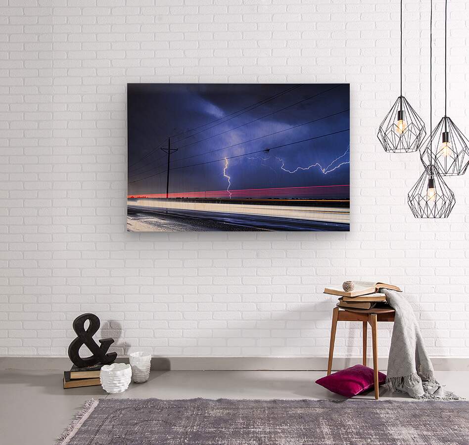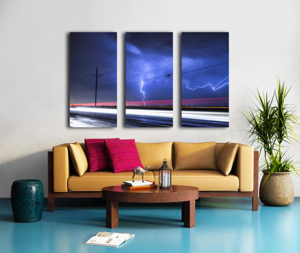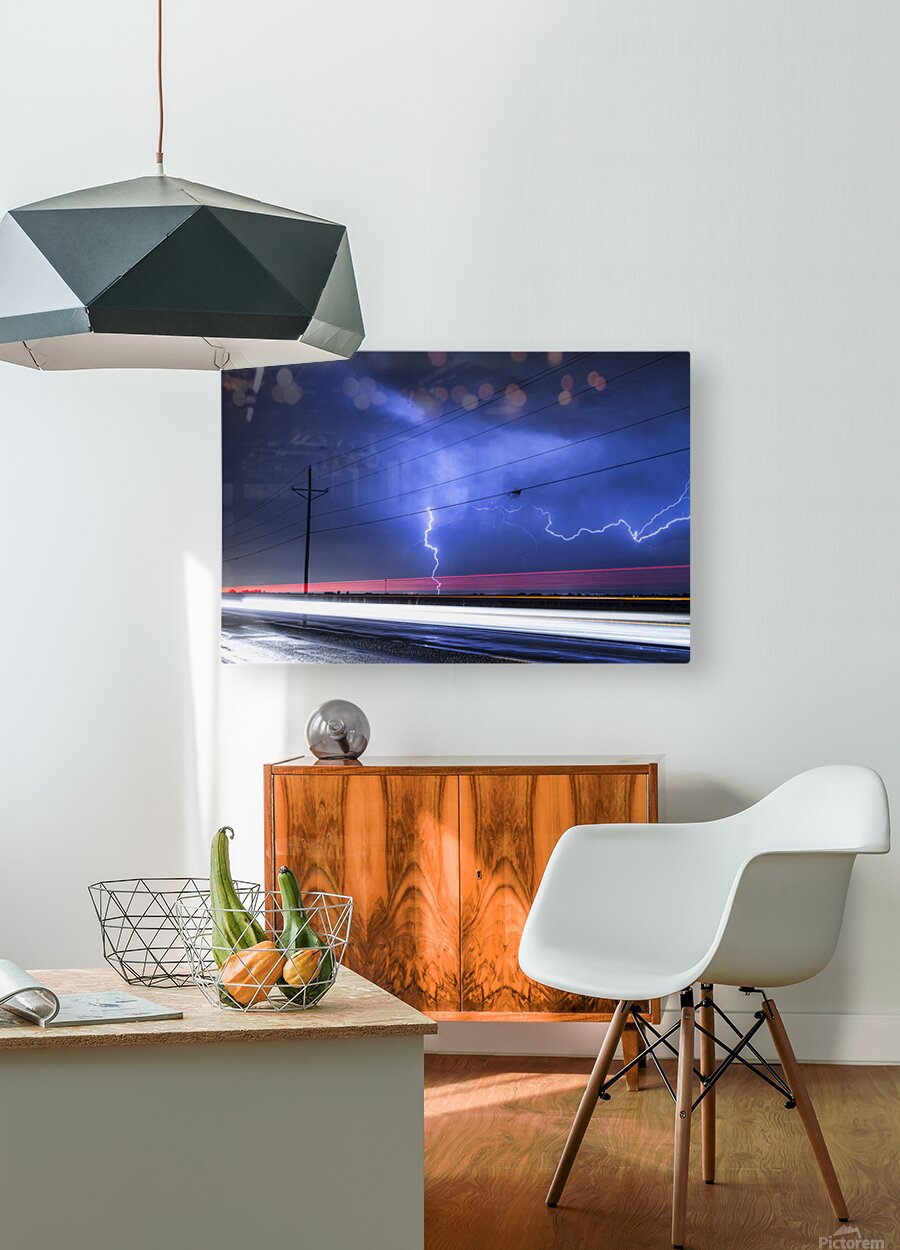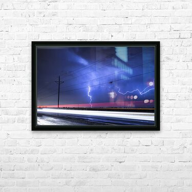A vivid lightning bolt strikes across the night sky illuminating storm clouds above an open highway. Long exposure captures the glowing streaks of vehicle lights contrasting the raw energy of nature with the flow of modern life. This fine art photography wall art print offers a bold and electrifying atmosphere for contemporary spaces.