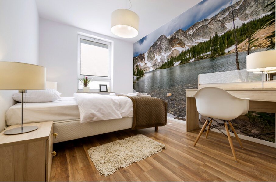This captivating fine art photography print presents a scenic lake view of the Medicine Bow Snowy Mountain Range in Wyoming, a majestic segment of the...[+]