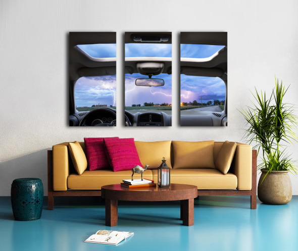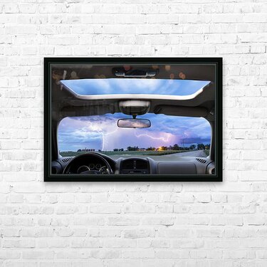 Immerse yourself in the awe of nature?s energy with this fine art composite photography print showcasing a lightning storm viewed through a car?s front windshield and sunroof. The dramatic sky illuminated by flashes of lightning contrasts beautifully with the calm interior capturing the spirit of adventure wonder and the open road. A striking piece of wall art for storm lovers and dreamers alike. Experience the thrill of nature?s raw power through this fine art composite photography print capturing a lightning storm as seen from inside a car. The dramatic view reveals the beauty of the open road the vast sky and the electric energy of the storm ? a perfect blend of adventure and artistry for your wall decor.