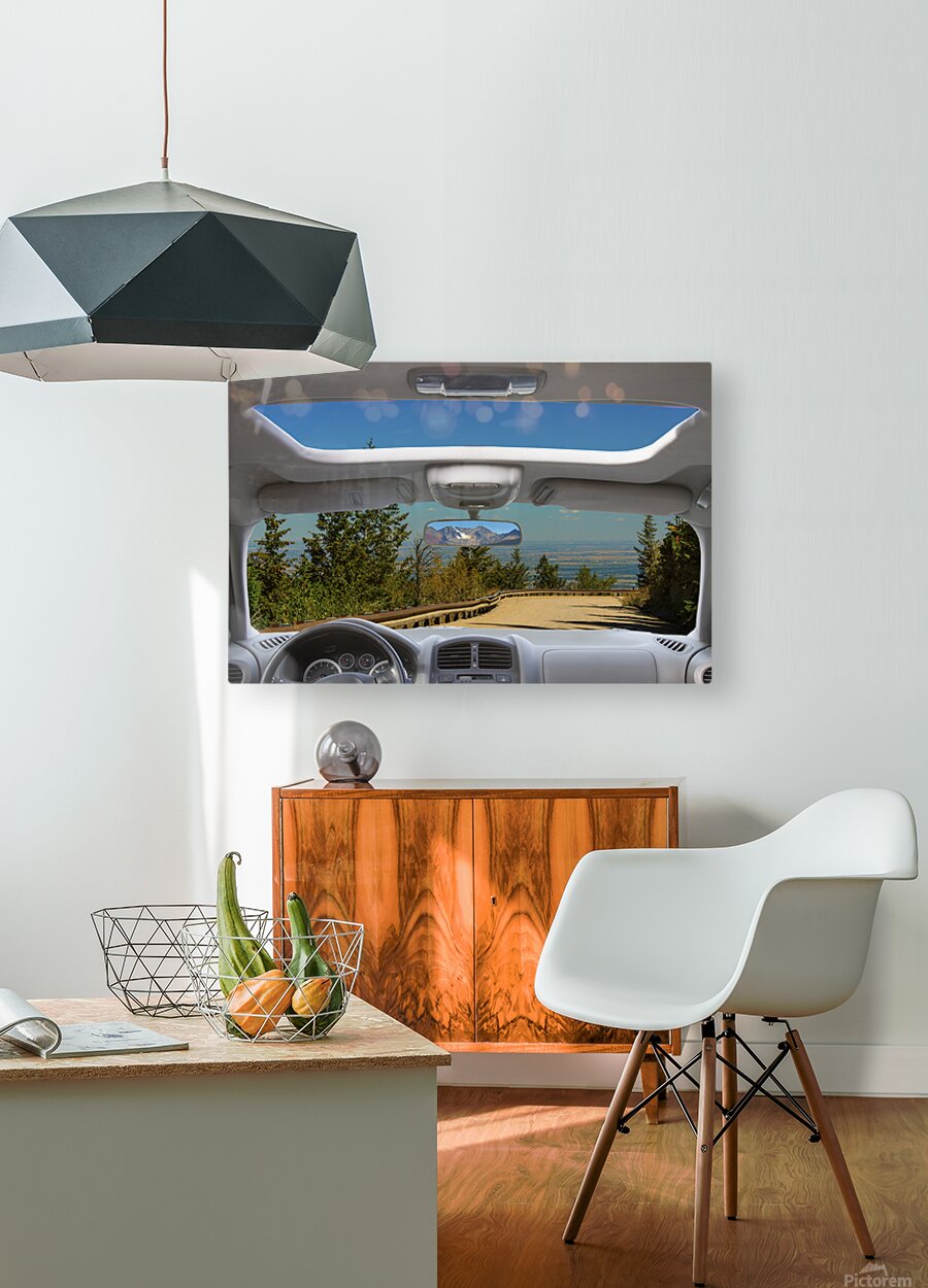 Feel the peaceful beauty of mountain adventure with this fine art composite photography print capturing a scenic downhill drive through a car?s windshield and sunroof. The winding road framed by evergreens and distant blue horizons evokes the freedom of the open road and the calm of descending from the high country. A perfect wall art piece for nature lovers and travelers at heart.