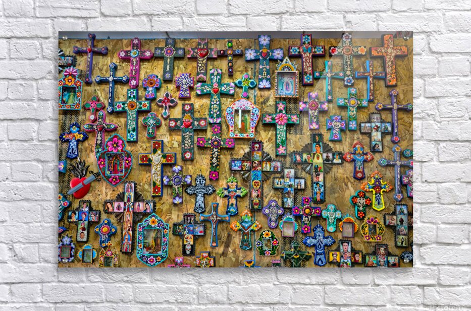 A vibrant fine art photograph featuring an expansive collection of traditional Mexican crosses arranged in a richly textured display. Handcrafted and ...[+]