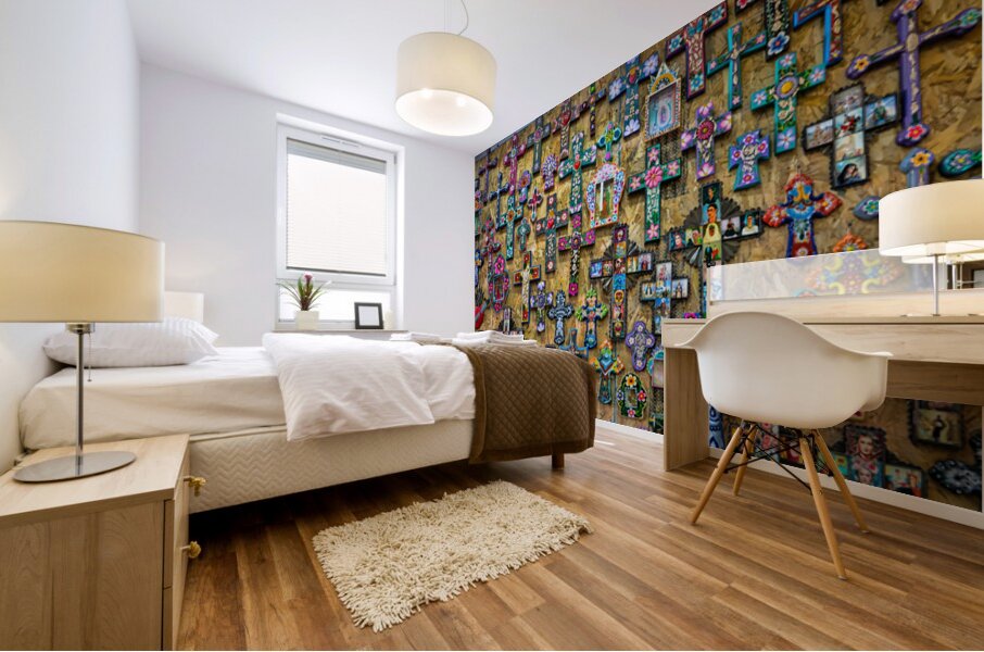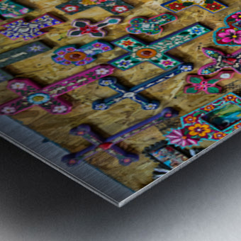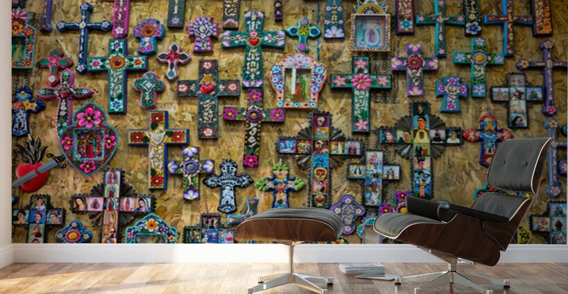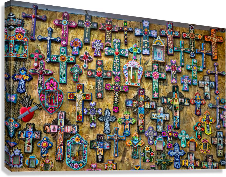 A vibrant fine art photograph featuring an expansive collection of traditional Mexican crosses arranged in a richly textured display. Handcrafted and adorned with bold colors floral motifs and folk art details these crosses reflect Mexico’s deep cultural heritage spiritual symbolism and artisanal craftsmanship making this image ideal for cultural wall art travel photography collections and collectors of authentic Mexican folk art imagery.