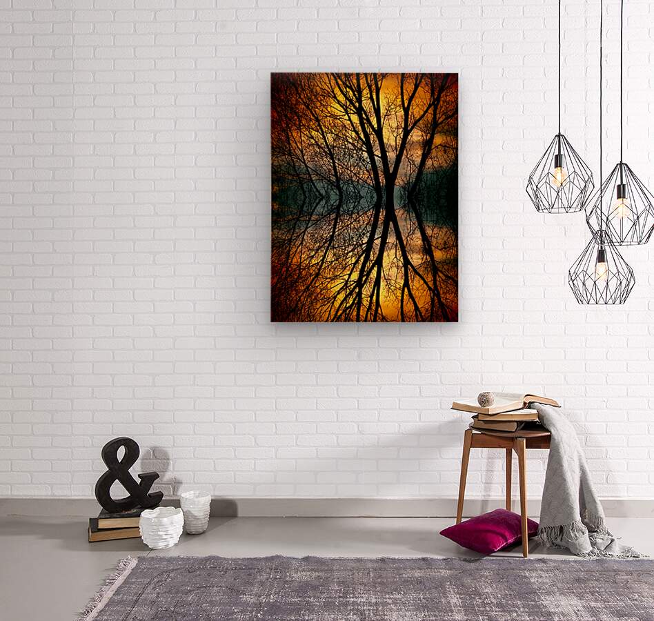 Experience the mesmerizing symmetry of nature with this abstract fine art photography print by James Bo Insogna. Featuring a bold silhouette of winter tree branches mirrored across a central axis this piece captures the intense glow of a golden sunset. The rich oranges deep ambers and cool blue undertones create a dramatic focal point perfect for modern home decor or office wall art. This high-quality nature silhouette print brings a sophisticated contemporary energy to any living space.