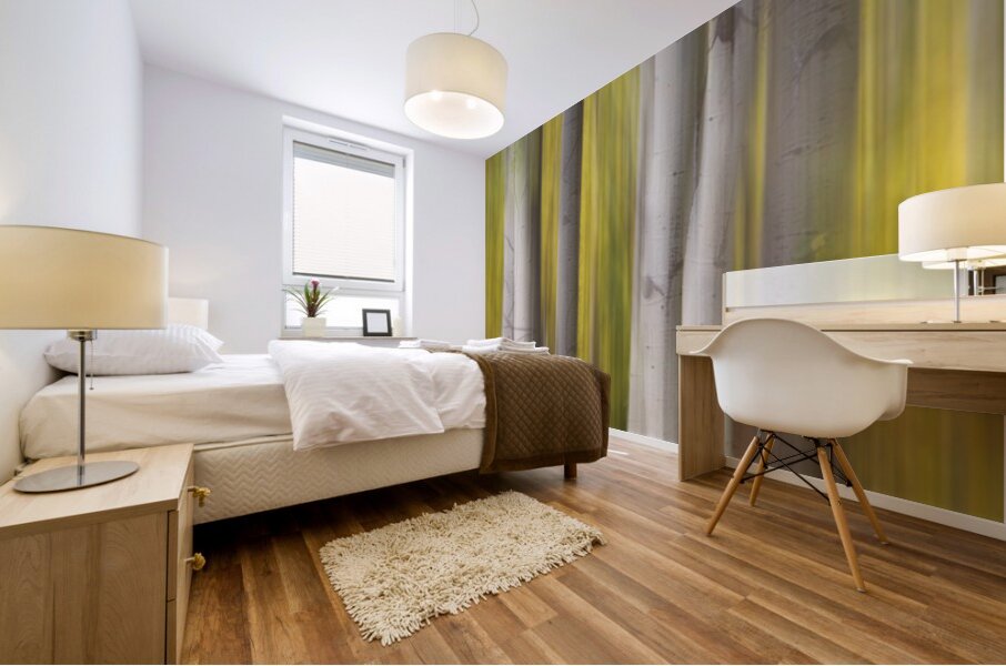 A luminous abstract forest composition where silver-white aspen trunks rise through flowing veils of golden autumn motion creating a tranquil and dreamlike landscape. This fine art photograph blends natural elegance with modern abstraction making it a refined wall art print for contemporary interiors luxury home d?cor gallery walls and curated art collections.