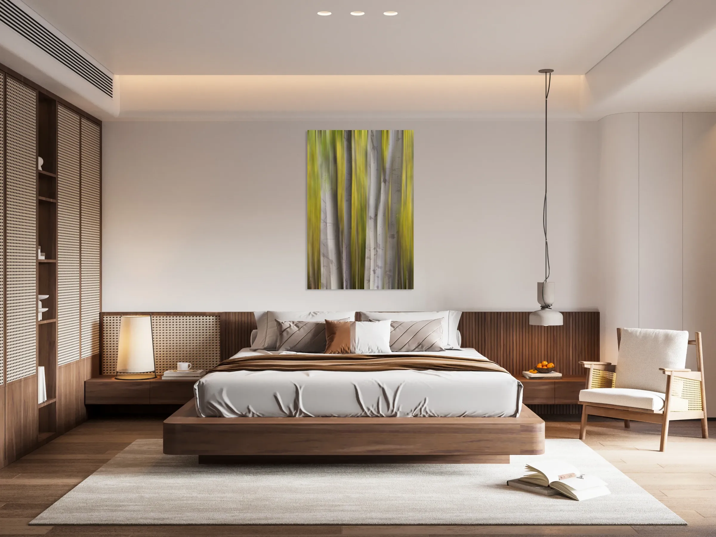A luminous abstract forest composition where silver-white aspen trunks rise through flowing veils of golden autumn motion creating a tranquil and dreamlike landscape. This fine art photograph blends natural elegance with modern abstraction making it a refined wall art print for contemporary interiors luxury home d?cor gallery walls and curated art collections.