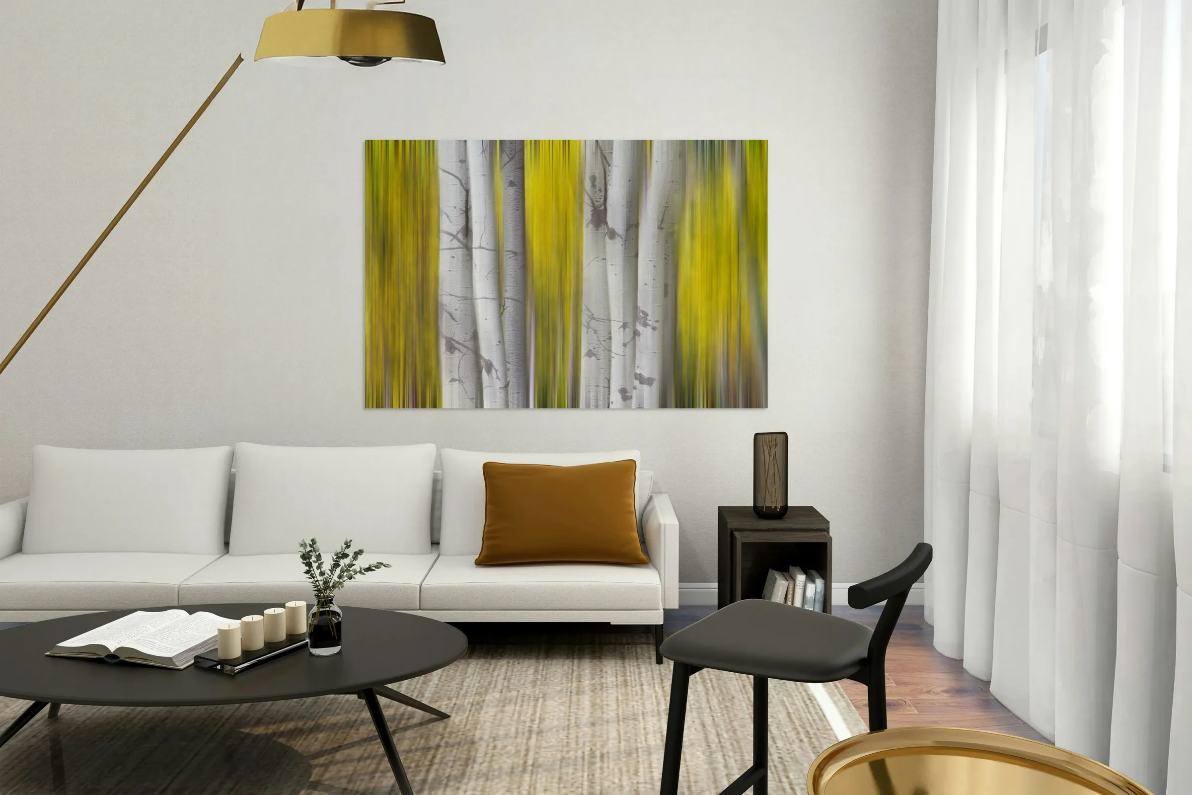 A refined abstract forest composition featuring luminous white aspen trunks layered with flowing ribbons of golden autumn color. This motion-inspired ...[+]