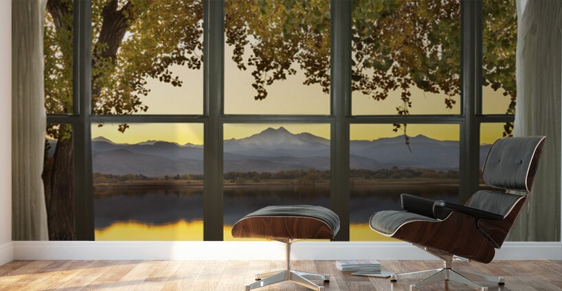 A serene fine art window-view composition framing golden autumn trees still water reflections and distant mountain peaks beneath a warm sunset sky. This elegant landscape photograph creates a sense of calm balance and depth making it a refined wall art piece for modern interiors luxury home d?cor gallery walls and curated nature art collections. Scenic landscape autumn season view of a large cottonwood tree golden sunset and the Colorado Rocky Mountains Twin Peaks Mt Meeker 13911 feet and Longs Peak 14.256 feet with peaceful water reflections. Bring nature indoors now you can add a bay window with a view to any room in your home or office with our picture window frame tm fine art striking photography nature landscape art prints. The IMAGE is the FRAME how cool is that! Create a fine art photography optical illusion of a beautiful bay window view. PLEASE NOTE : The Window Frame is part of the image. This is a composite fine art work. We recommend printing as frame-less acrylic print metal print or canvas wrap with black sides . Question: Do you have a home or office room without any windows? Do you want to set the mood in a room decor? Do you dream of a room with a view? The Answer: Now you can have a window with a view in any room with our NEW picture window frame fine art striking photography nature landscape poster prints canvas wraps acrylic fine art prints and metal prints... all with a view and ready to hang by photographer James Bo Insogna. This is an incredible way to decorate your office walls home walls cafe health clinic restaurant boardroom waiting room trade booth corporation or almost any commercial space. Colorado fine art nature landscape photography images by James Bo Insogna C - All Rights Reserved. If you are interested in licensing this image please hit the contact us for a custom quote. *PLEASE NOTE WATERMARKS WILL NOT BE ON THE PURCHASE PRINTS*